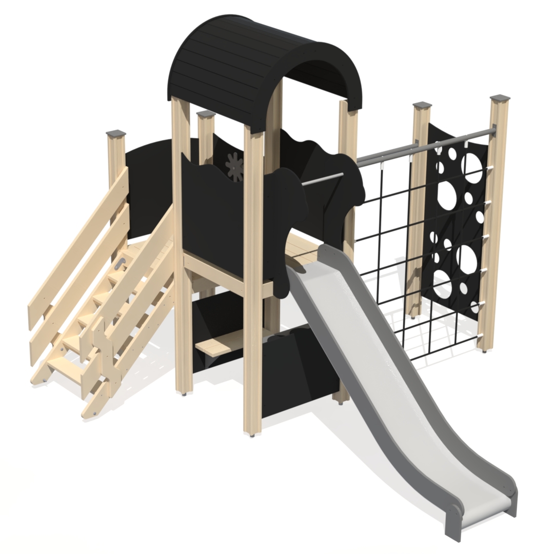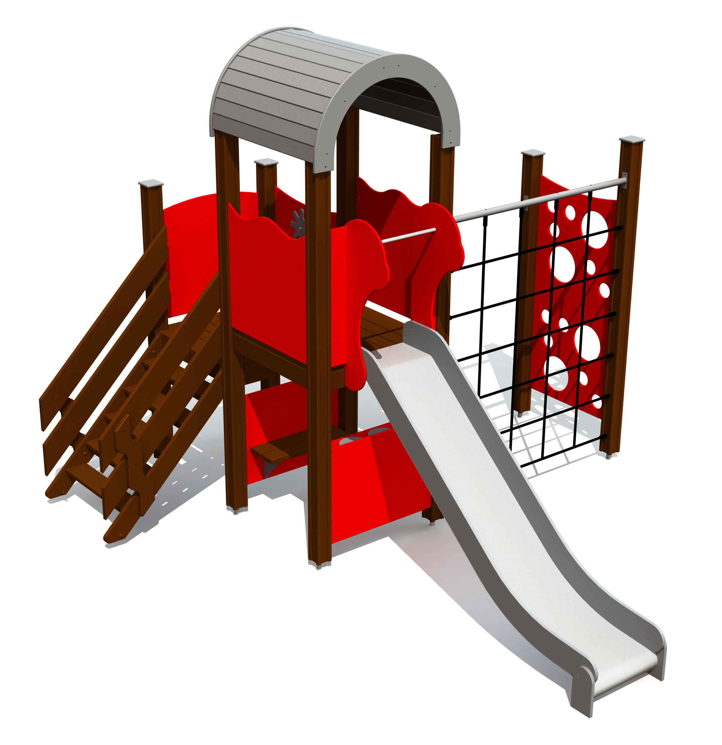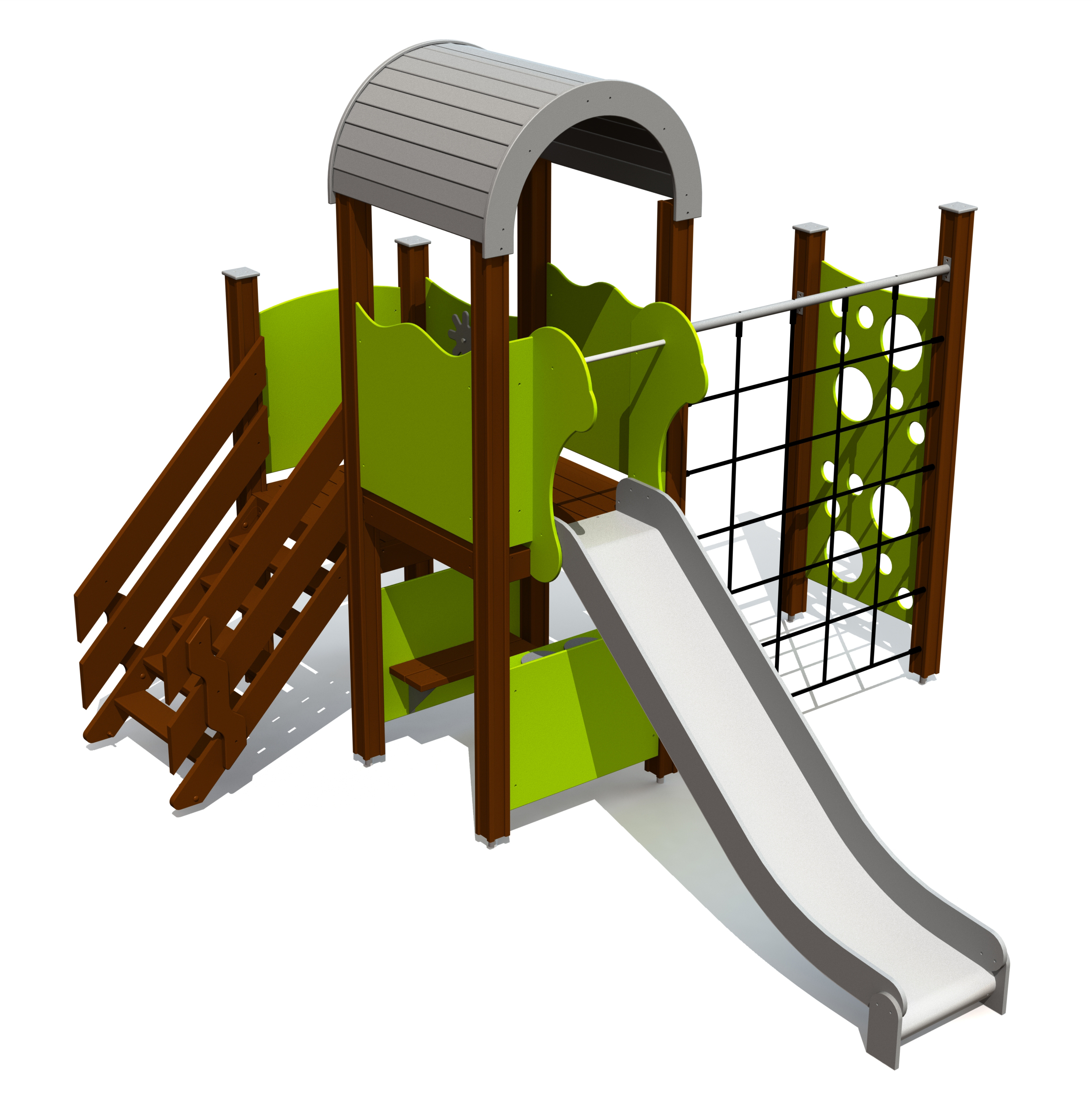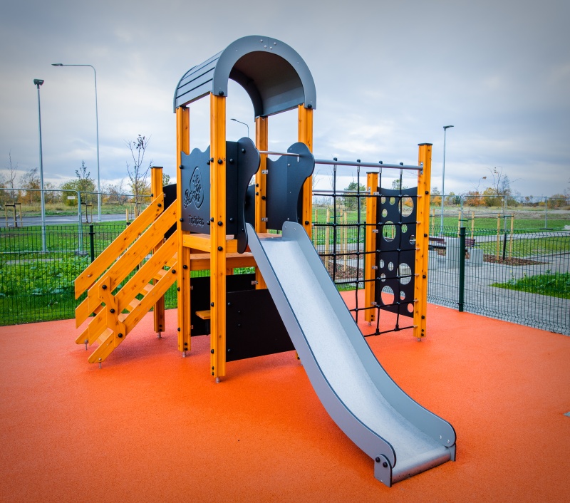 Komplett lekcenter med rutschkana, klätternät, klättervägg och rolllek som passar aktiva barn på offentliga lekplatser.