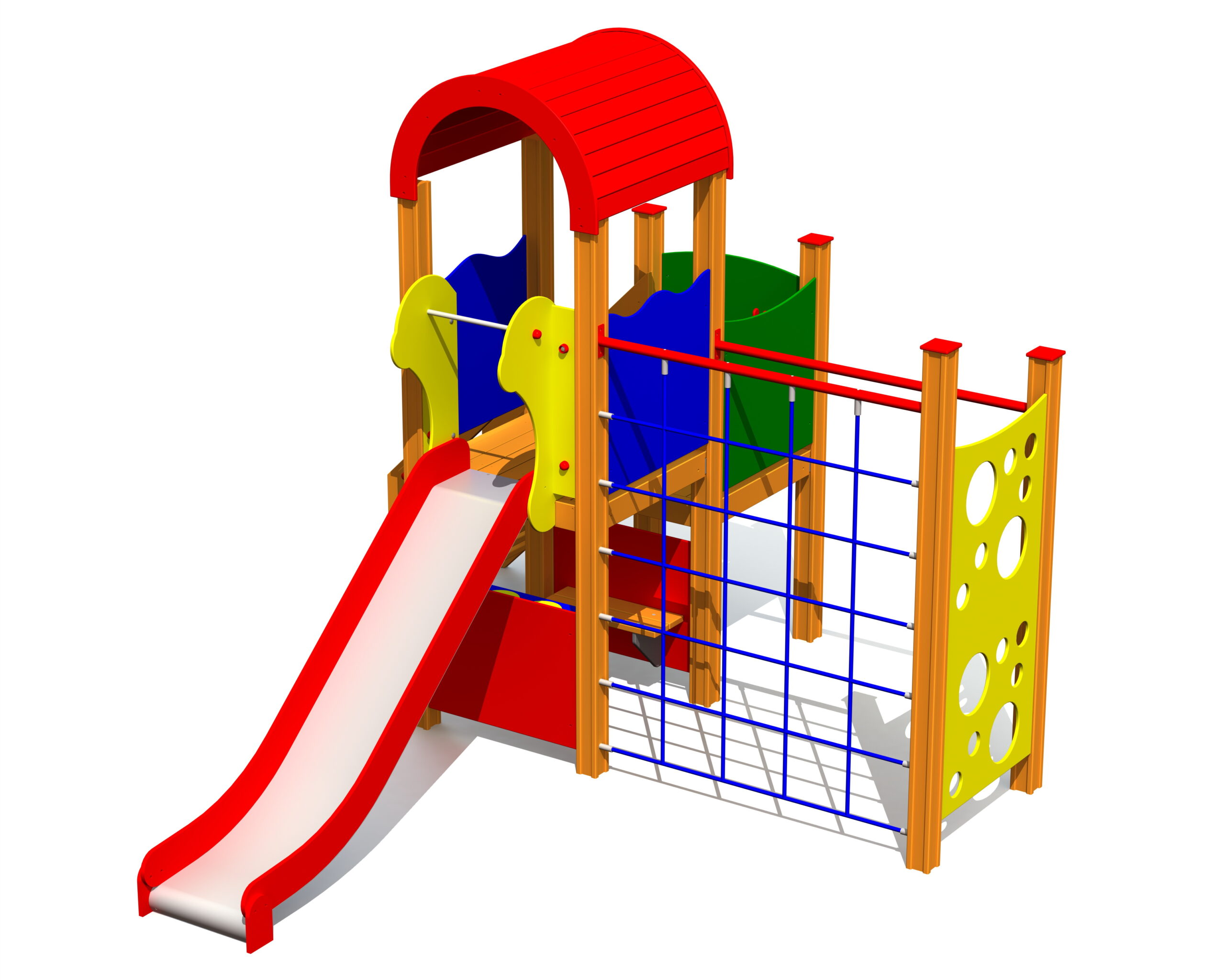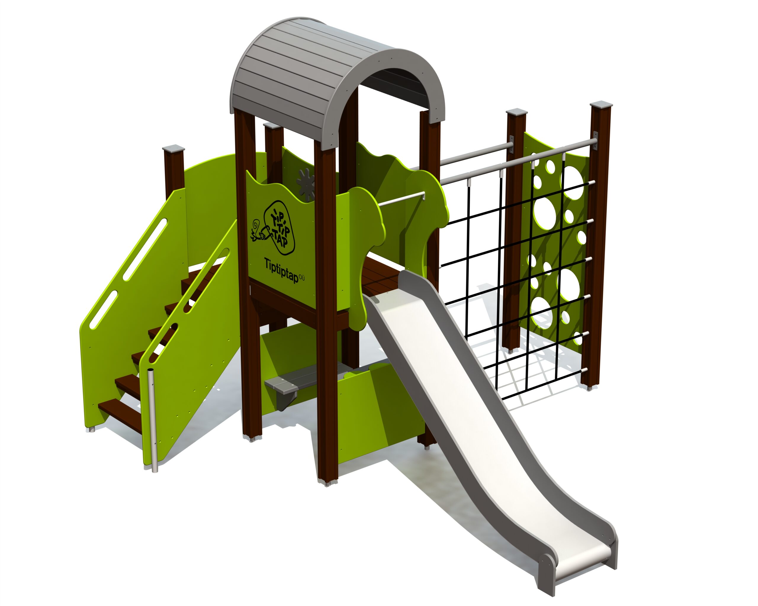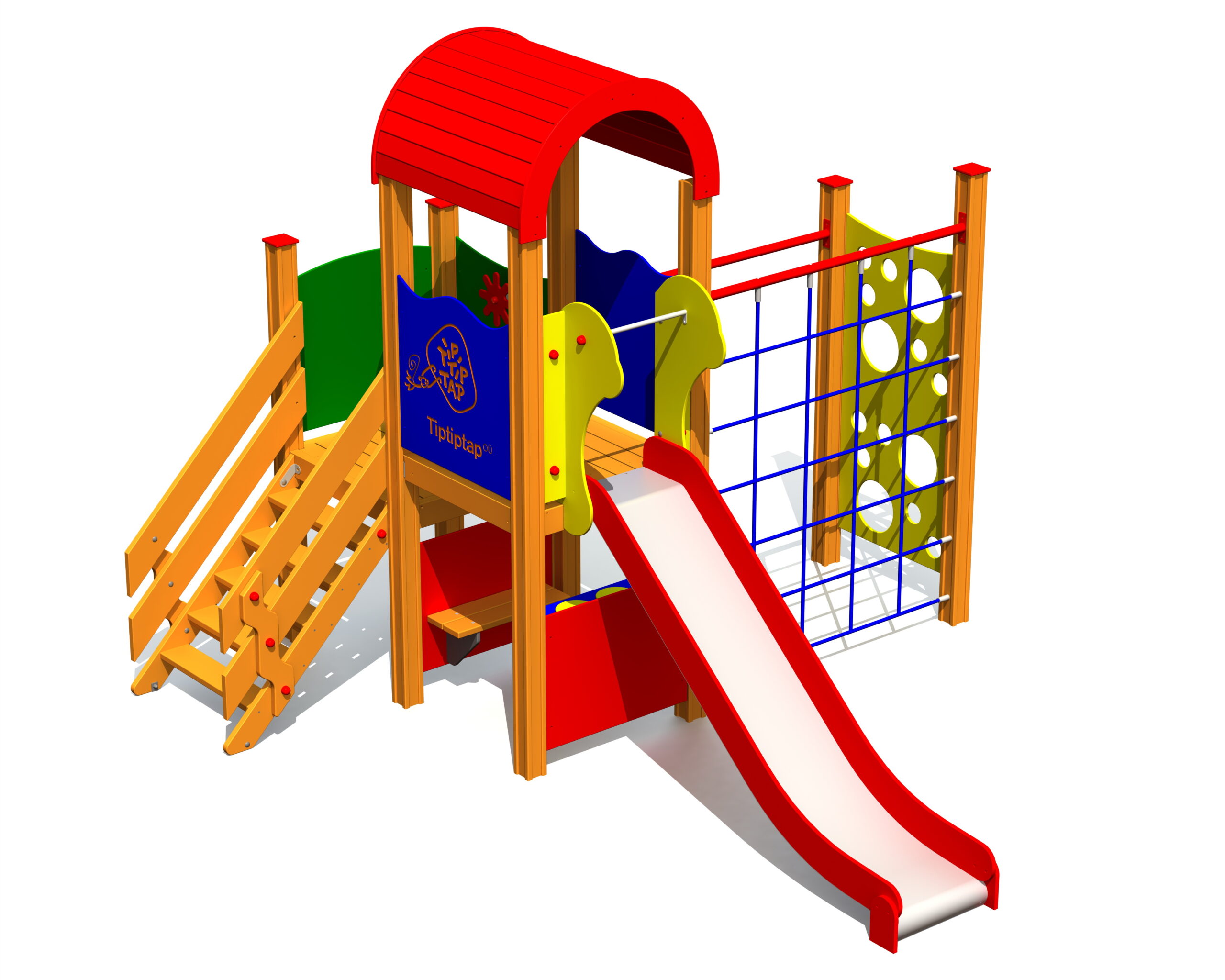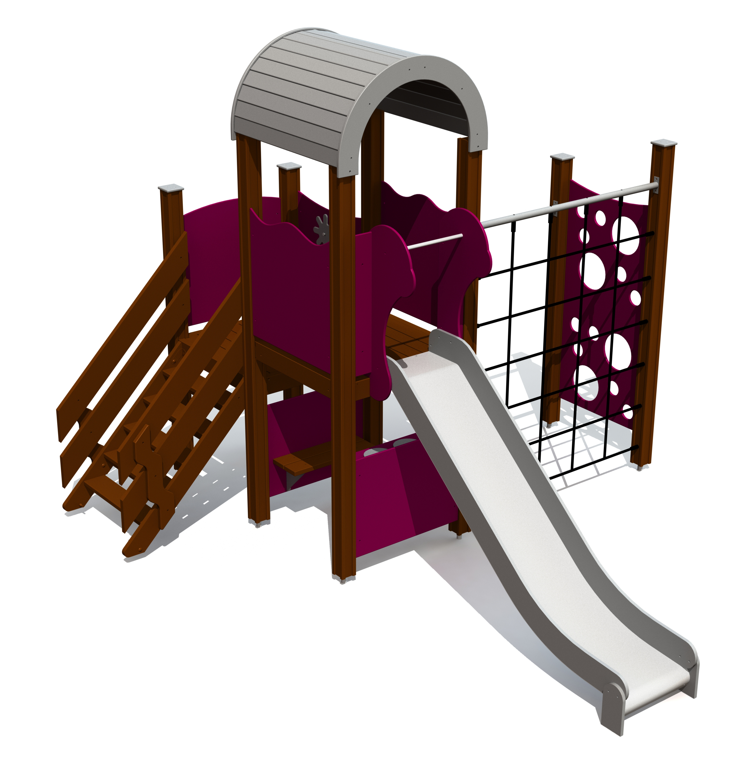 Komplett lekcenter med rutschkana, klätternät, klättervägg och rolllek som passar aktiva barn på offentliga lekplatser.