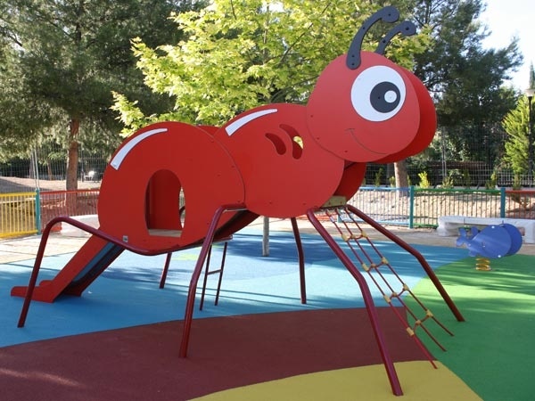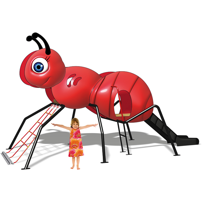 Myrformad lekplats med två plattformar sammanbundna med ramp, rutschkana, klätter- och glidstavar formade som myrben, klätternät och stege. Tillverkad av UV-beständiga HPL-paneler, galvaniserat och pulverlackerat stål samt autoklaverat trä. Installation sker via ytmontering med bultar. Plattform kan utföras i HPL för lägre underhåll.