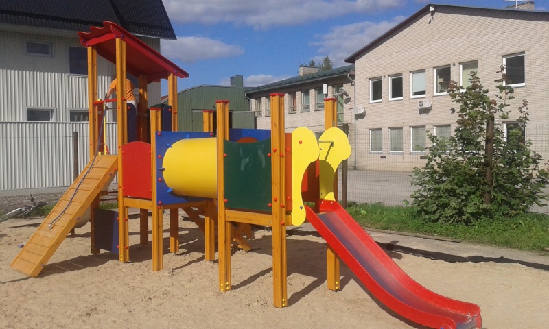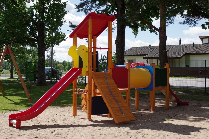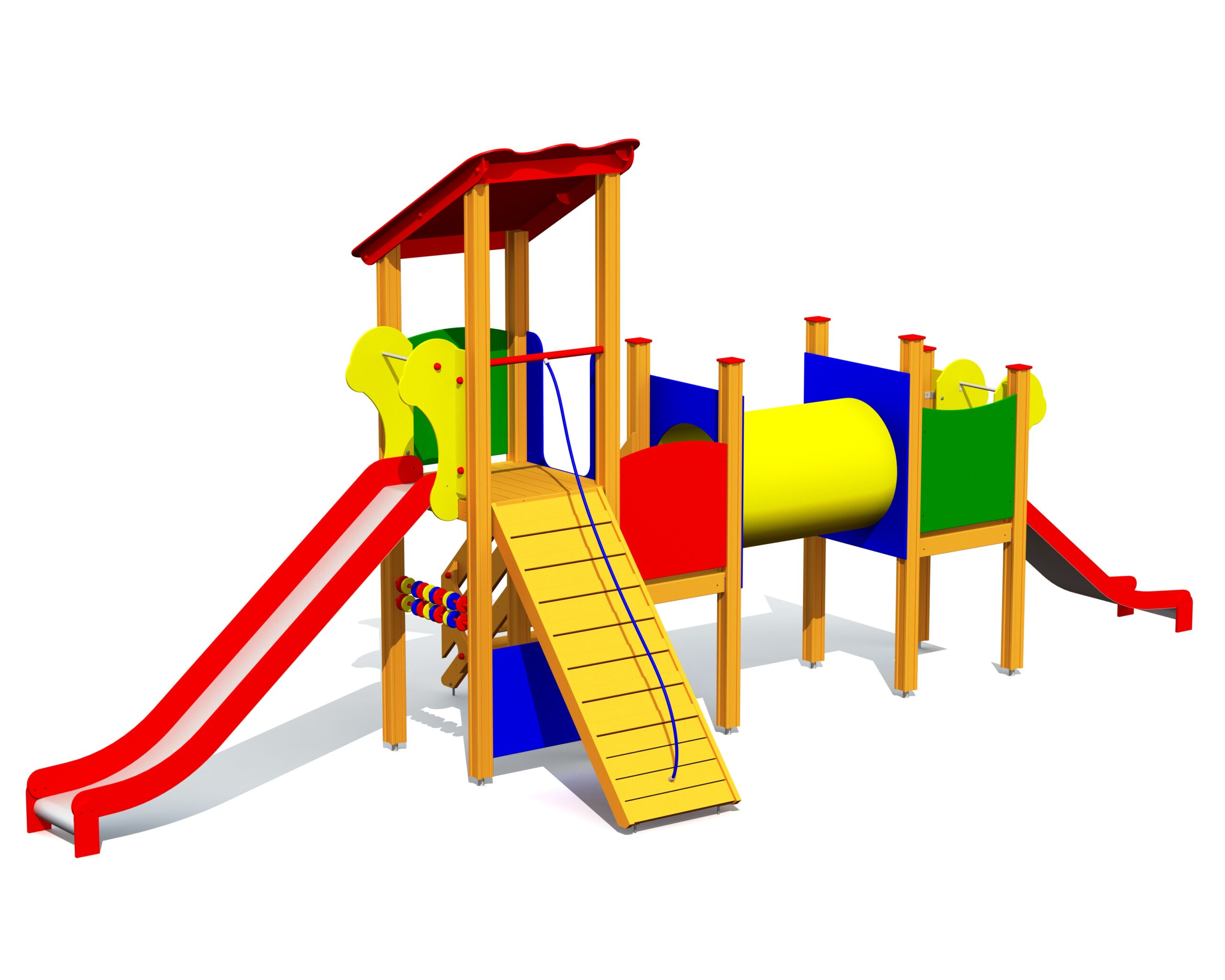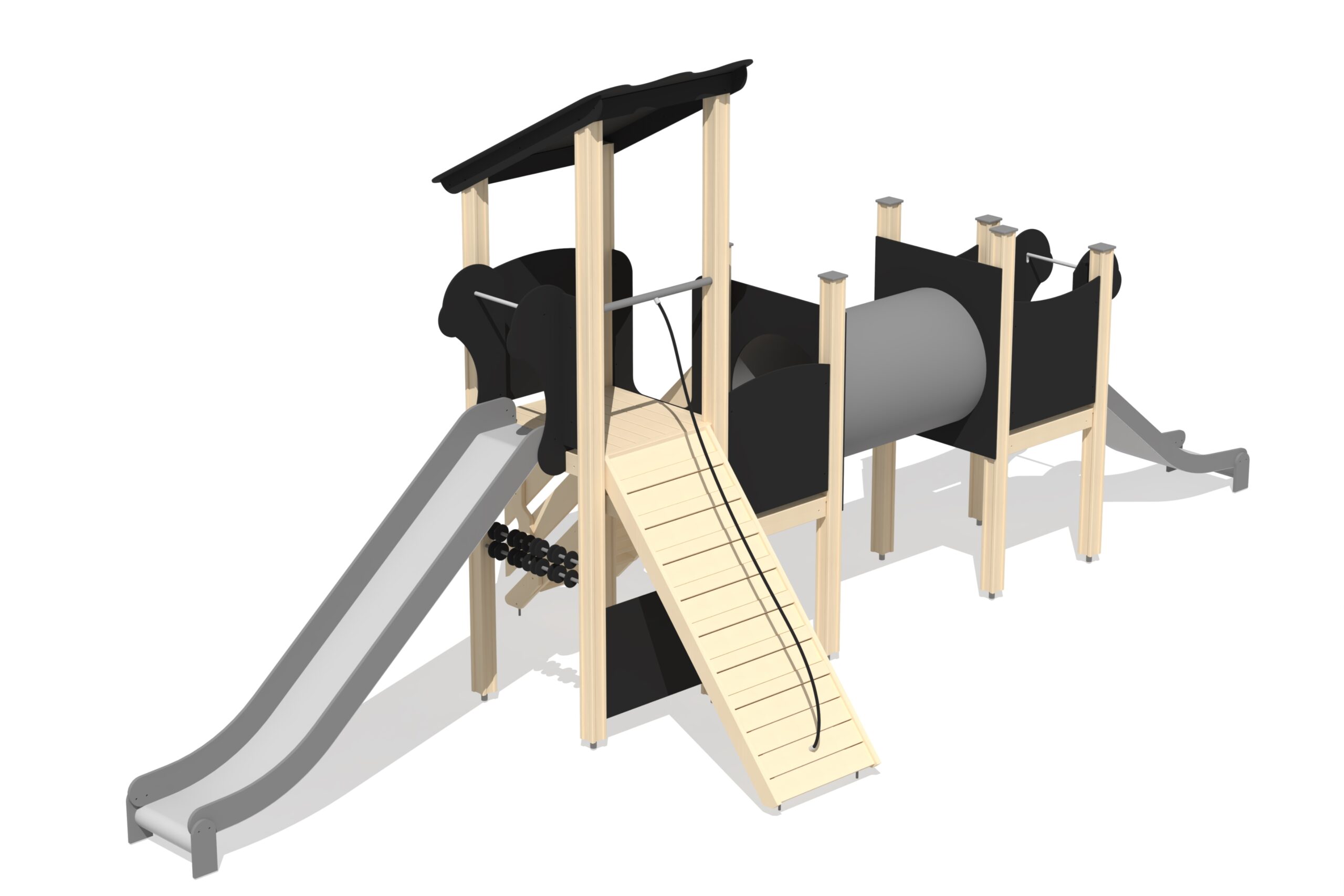 Lekcenter med tre plattformar, tunnel och två rutschkanor. Trappor med ledstänger leder till den nedre plattformen där en kryptunnel tar barnen till rutschkanan. En sluttande bro leder till den övre plattformen med tak och ytterligare rutschkana. Under den högre plattformen finns en kulram. Sidopanelerna kan anpassas med aktivitets- eller temapaneler.