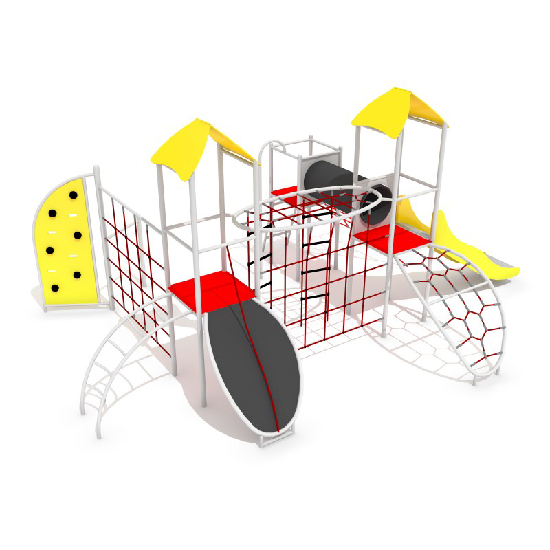 Multifunktionellt klätterset med tre torn, tillverkat av galvaniserade och pulverlackerade stålrör med rundad profil för lång livslängd. Plattformarnas golv är täckta av PE-plåt med halkskydd som ökar säkerheten. Lekställningen är utrustad med polypropenrep på 16 mm förstärkta med stålkärna. Rutschkanan har glidyta i rostfritt stål och sidor av HDPE-material. Plastskivor kan väljas som tillval. Lekplatsutrustning anpassad för barn i åldern 3–15 år.