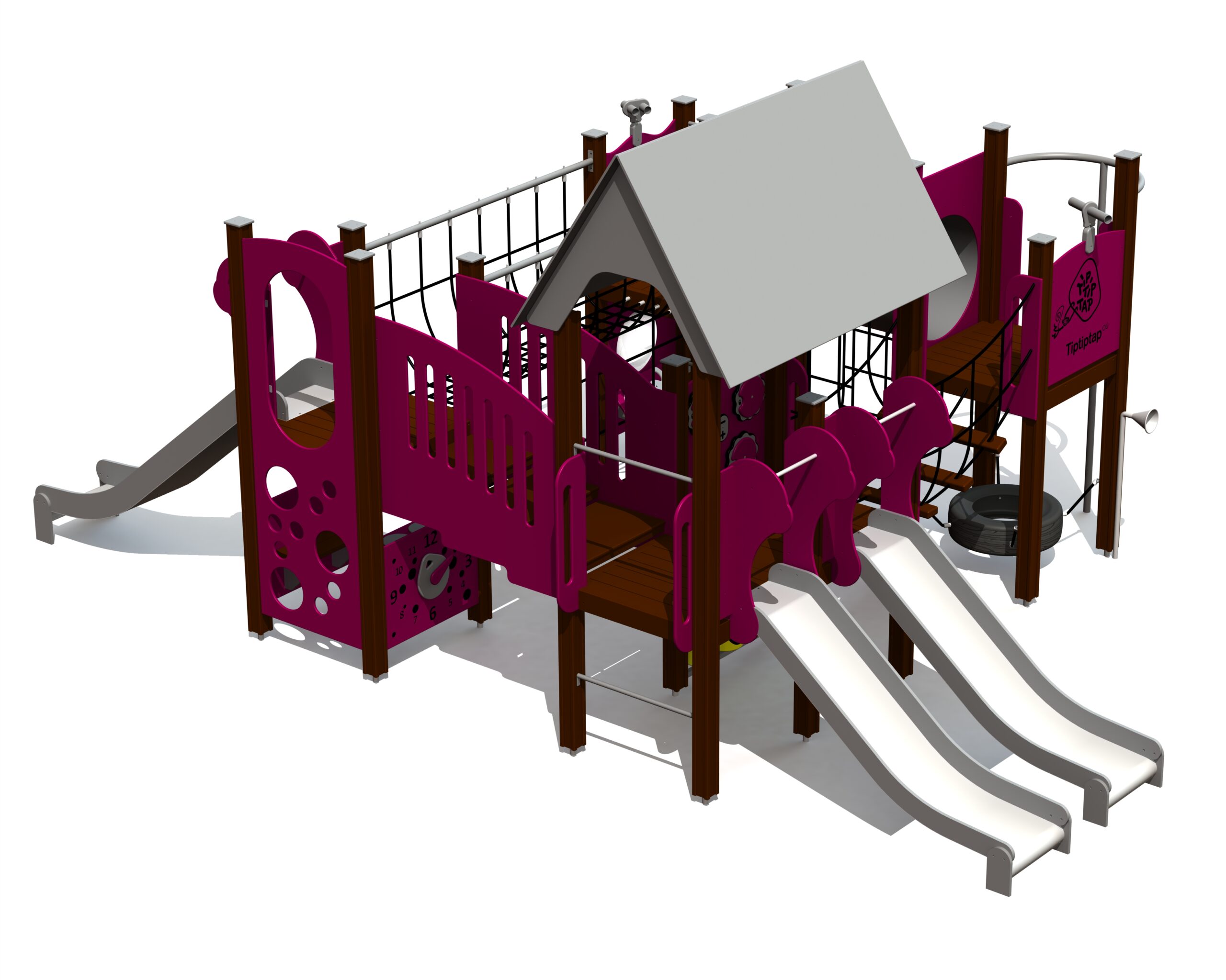Lekcenter med fem plattformar som nås via stegar eller klättervägg. Hängbro med rörliga steg, nätbro, kryptunnel och sluttande bro binder samman nivåerna. Tre rutschkanor och brandmansstång ger nedfart. Utrustad med kaptensroder, kikare, hyttventil, talrör, liggsäte, klockpanel och Tic-Tac-Toe. Två lekhörnor med bänk kan utrustas med kök eller bilinstrumentpanel. Sidopaneler kan anpassas vid beställning.