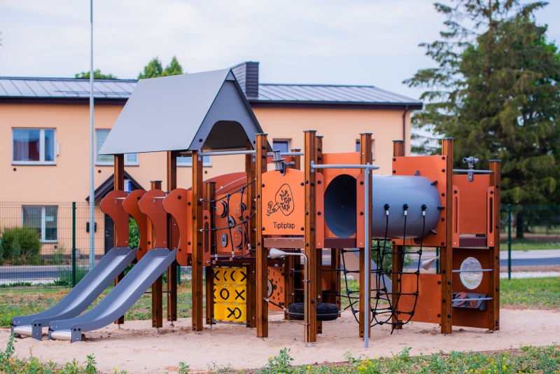 Stort lekcenter med många plattformar, rutschkanor och rollspelselement för varierad och fantasifull lek.