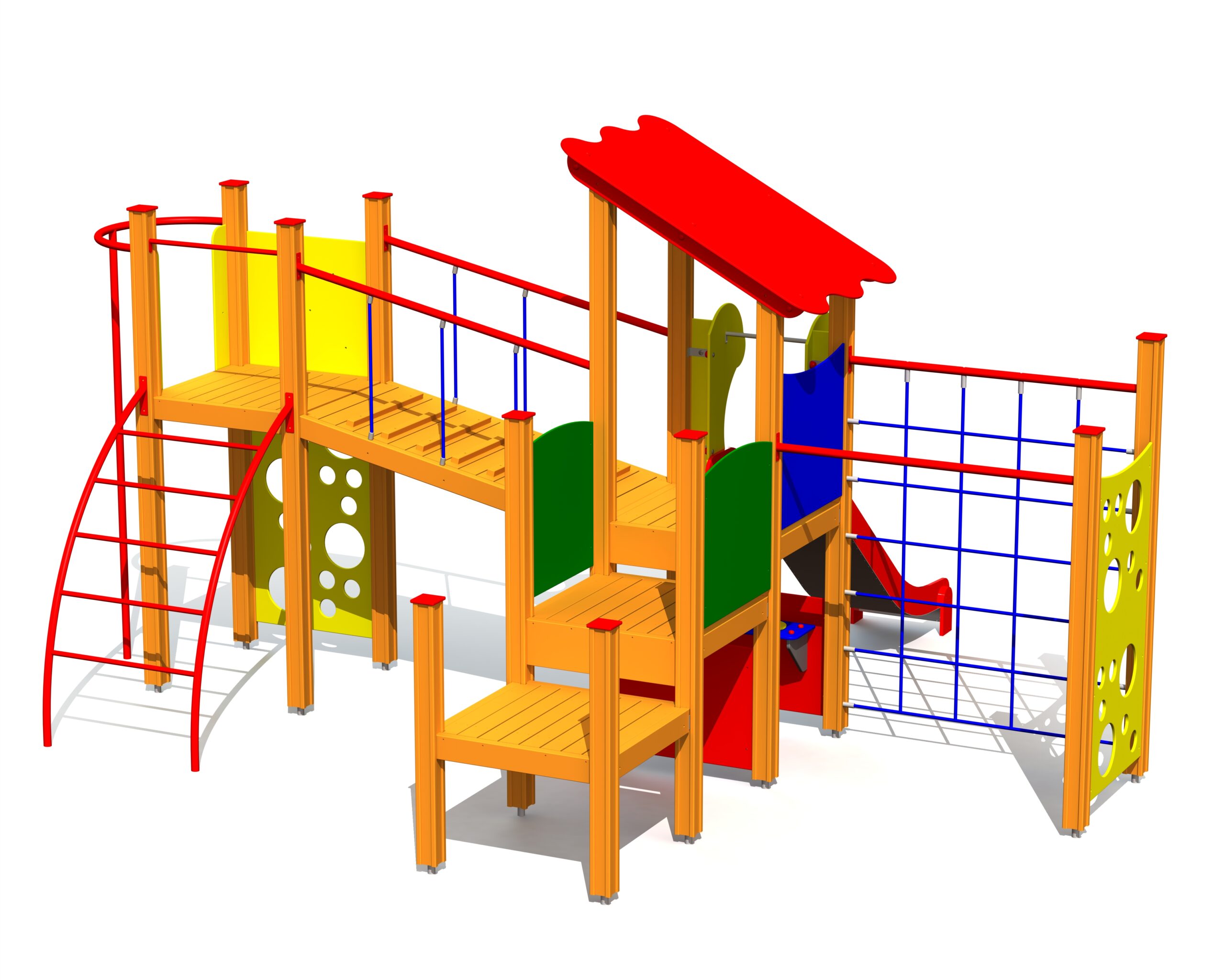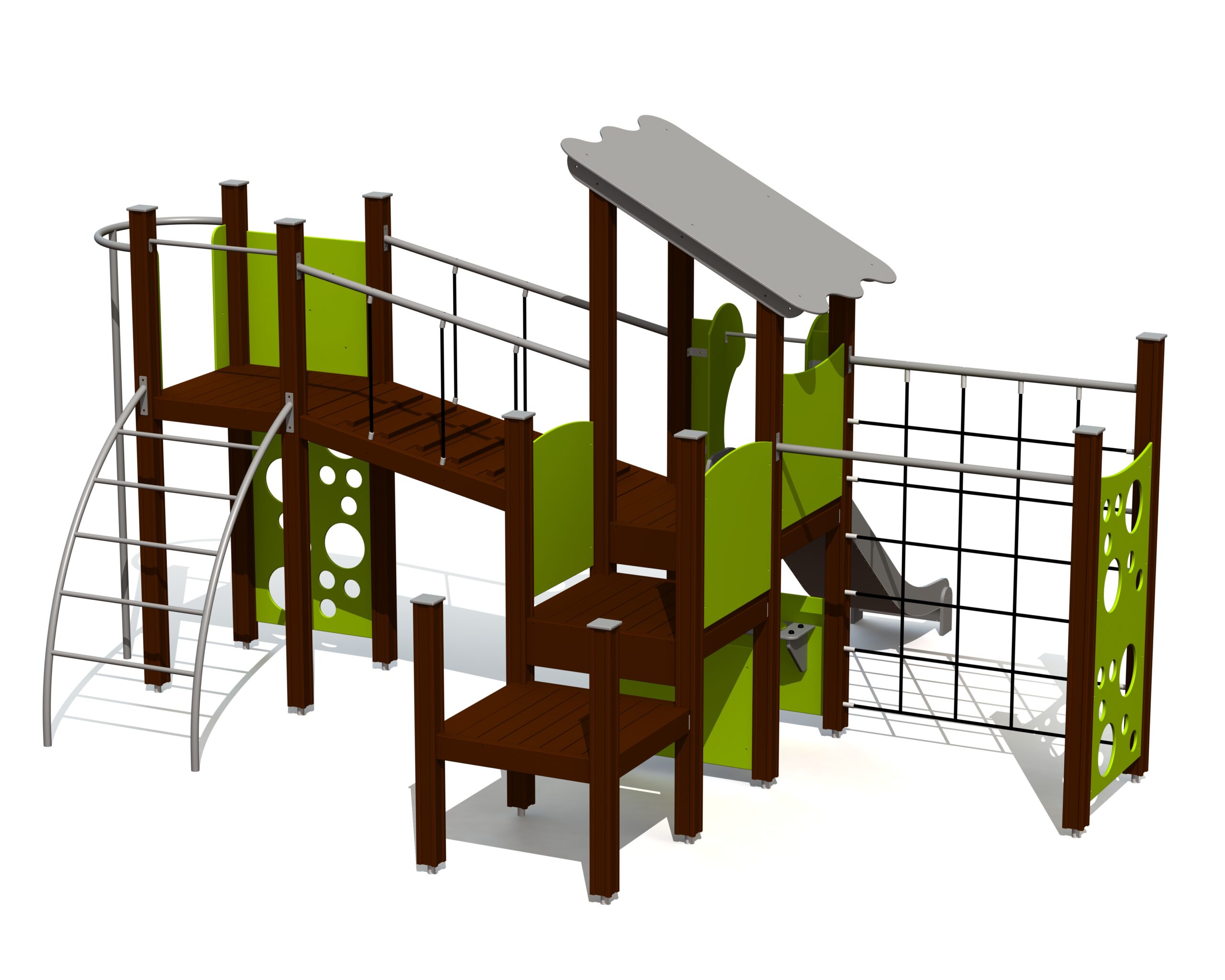 Avancerad lekställning med flera plattformar, klätternät, broar och rutschkana för fartfylld och utmanande lek.