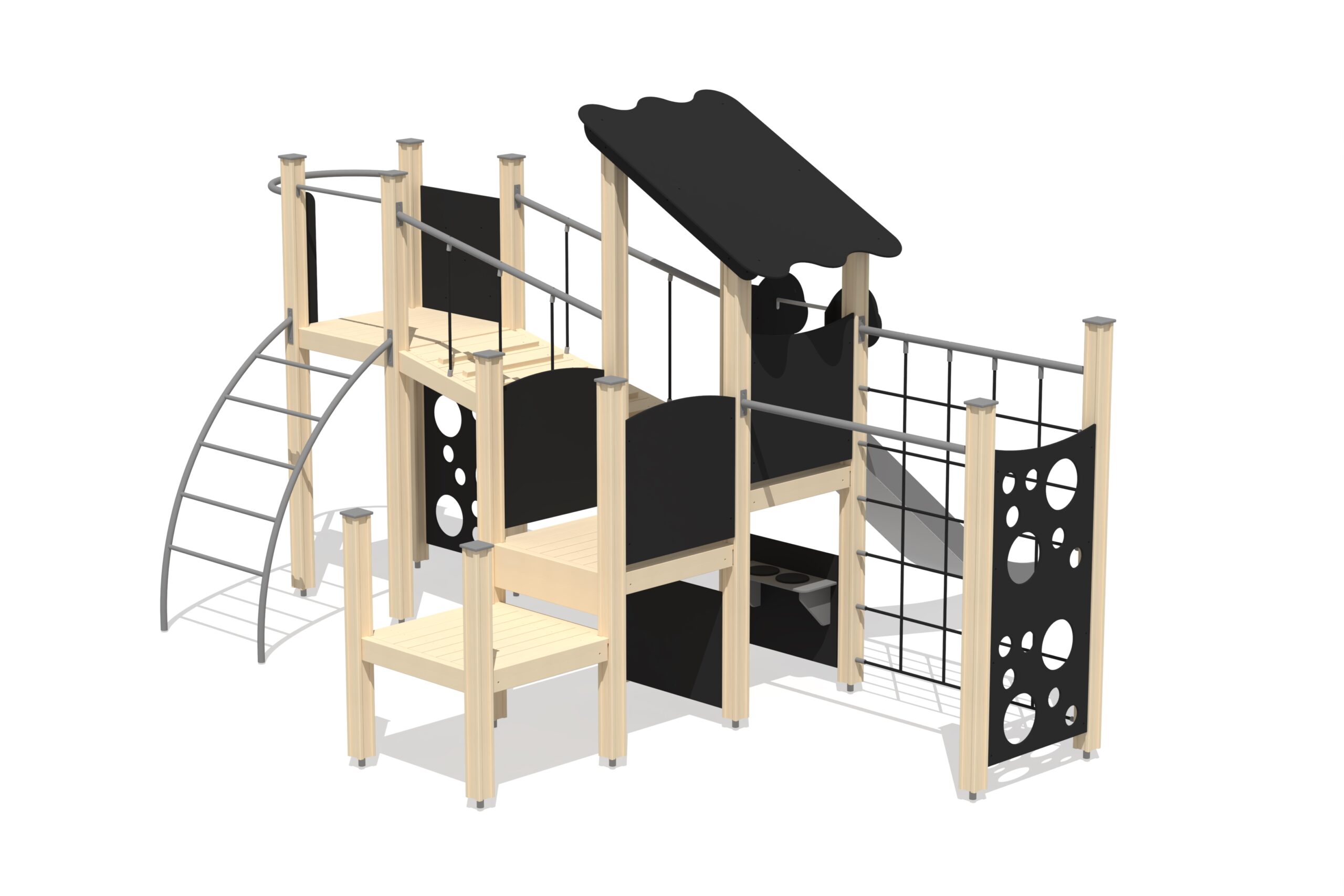 Lekställning Raymond består av fyra plattformar, bro, klätternät, rutschkana, klättervägg, brandmansstång och välvd stege. Lekcentret nås från den nedre plattformen och den högre kan nås via bron eller stegen. En brandmansstång ger snabb väg ner. Lekställningen är utrustad med kaptensroder och lekhörna med bänk som kan förses med köks- eller bilinstrumentpanel. Sidopanelerna kan anpassas med aktivitetsväggar eller tematiska tryckta motiv.