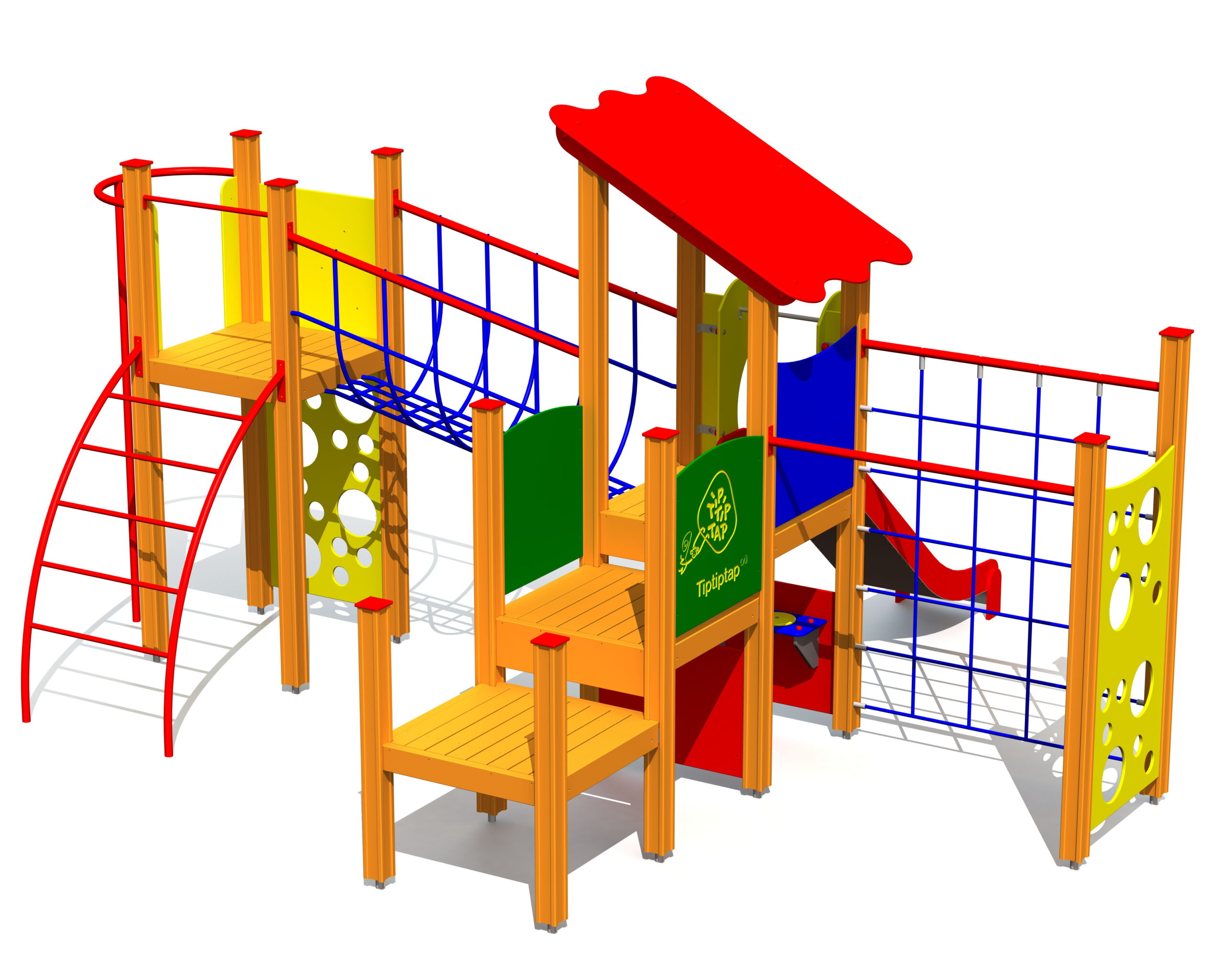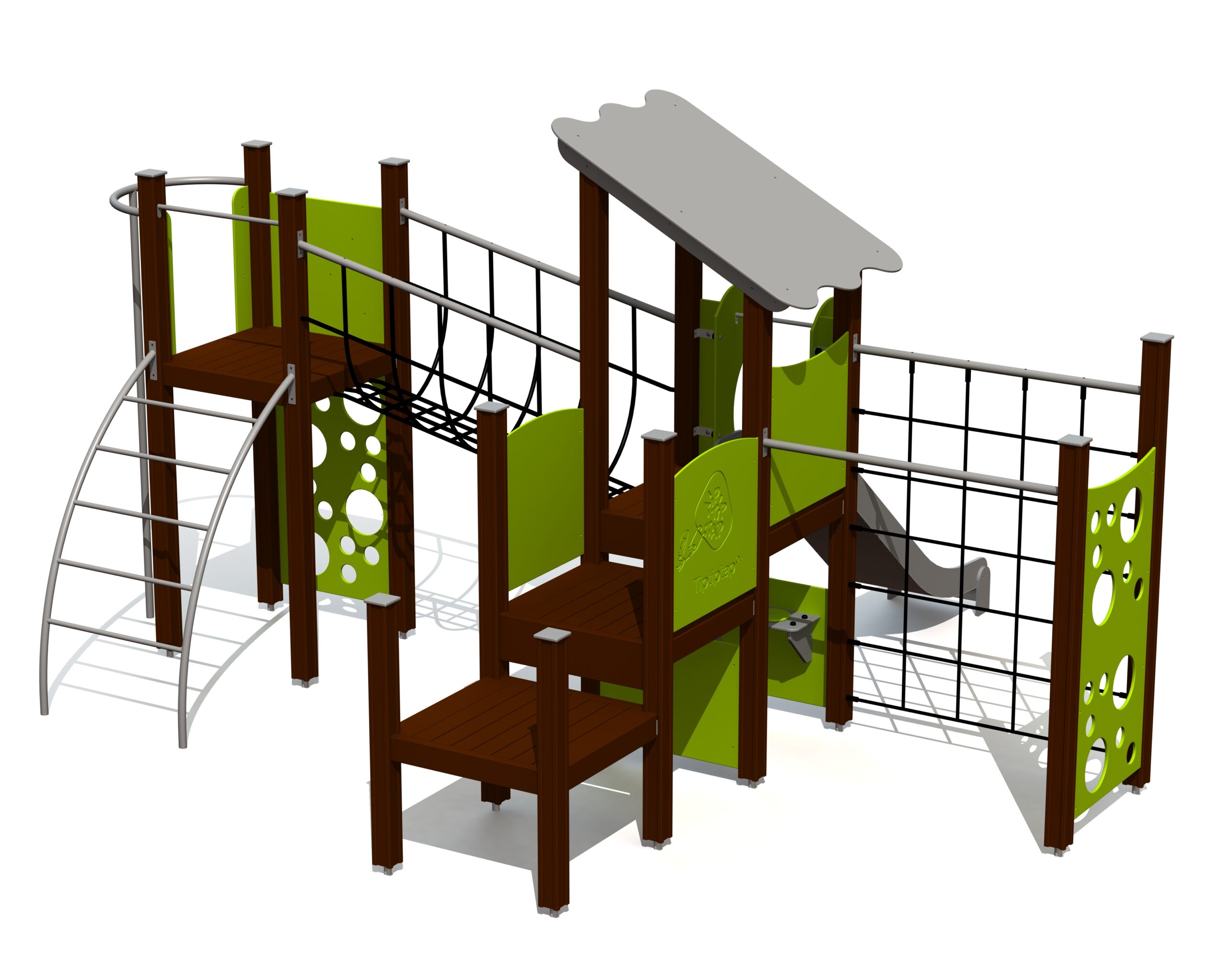 Stor och komplett lekby för barn 4–15 år med flera plattformar, broar, klätternät och rutschkanor för intensiv lek.