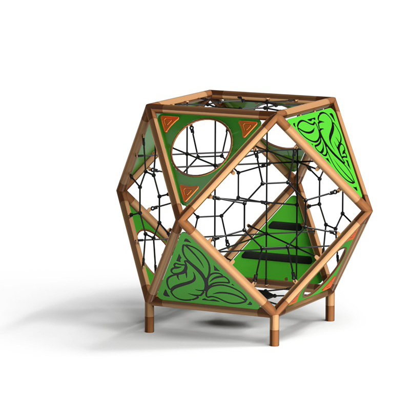 Naturnära lekställning med sfärisk form som uppmuntrar barn till klättring och fantasifull lek. Kombinationen av design och funktion skapar en spännande lekupplevelse.
