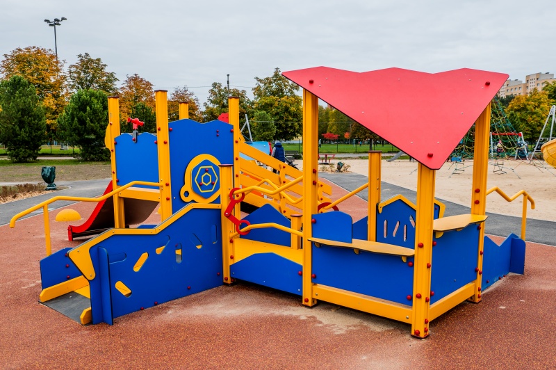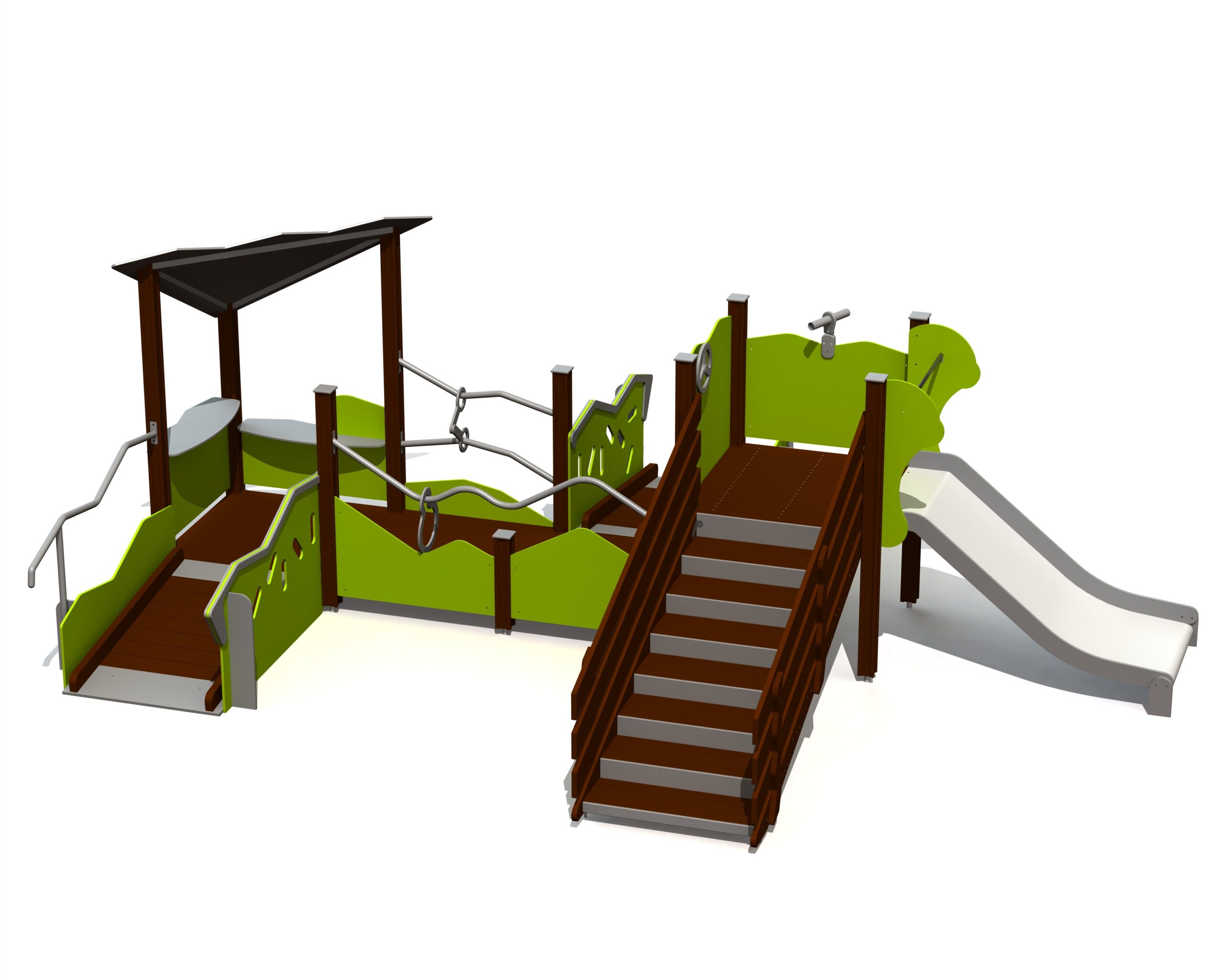 Lekcenter som kan nås via extra breda trappor eller ramp med skyddsräcken, anpassat för rullstol eller lek tillsammans med vårdare. Steg, ledstänger och sidopaneler är bredare och högre för extra stöd. Rutschkanan är bred för gemensam åkning. Visuella kontraster hjälper synskadade barn. Lekcentret är utrustat med flera aktivitetspaneler som tränar finmotorik, koordination och sensorisk upplevelse.