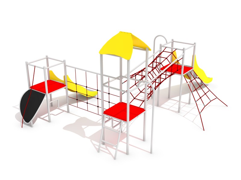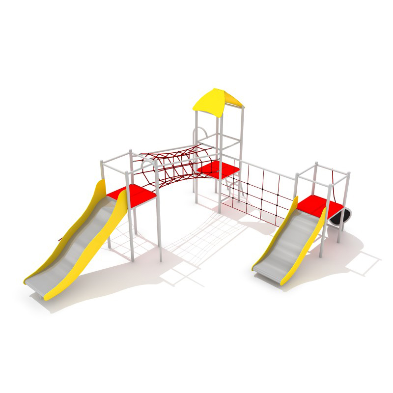 Multifunktionellt klätterset med tre torn, konstruerat av galvaniserade och pulverlackerade stålrör med rundad profil för hög hållbarhet och säkerhet. Plattformarnas golv är täckta av PE-plåt med halkskydd som ger trygg användning även vid intensiv lek. Lekställningen är utrustad med polypropenrep på 16 mm förstärkta med stålkärna. Rutschkanans glidyta är tillverkad av rostfritt stål och sidorna av slitstarkt HDPE-material. Plastslid kan väljas som tillval. Avsedd för barn i åldern 3–15 år.