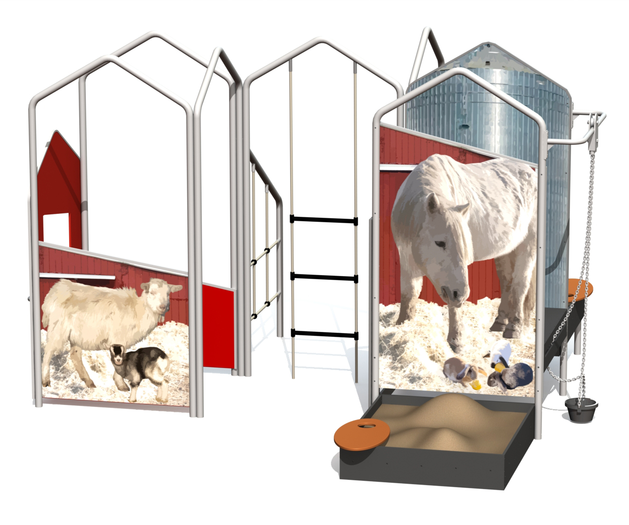 Lekställning i FARMLIFE-serien med gårdstema, klättermoment och sandlek för varierad aktivitet i offentlig utemiljö.