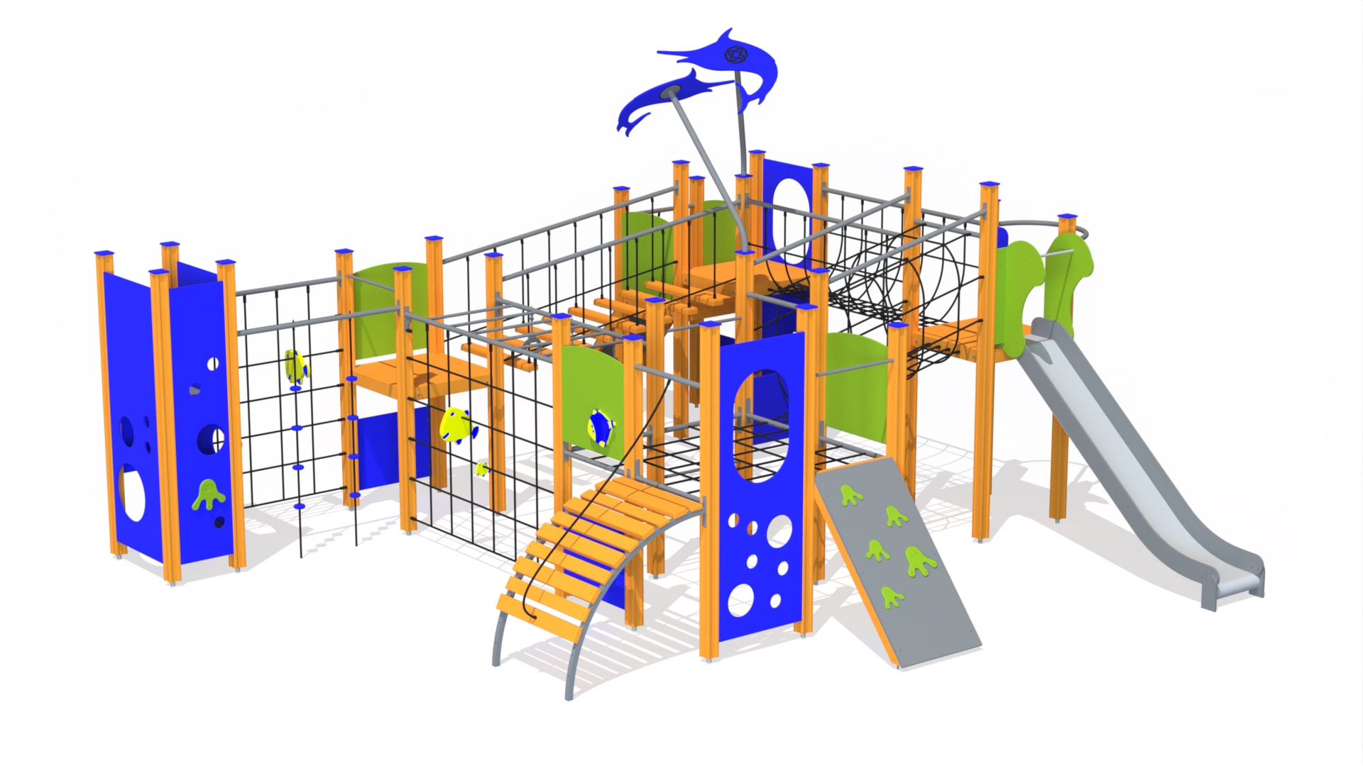 Lekställningar Eldaris ingår i serien WATER WORLD och är en lekställning som kombinerar rörelselek, balans och social interaktion i en tydlig vatteninspirerad miljö. Utformningen stödjer både fri lek och gemensamma aktiviteter där barn kan utforska, samarbeta och utveckla motorik på ett tryggt och engagerande sätt. Specifikationer: rekommenderad ålder: 4+; max fallhöjd: 1,92 m; mått ca 6,87 x 7,89 x 2,86 m (L x B x H).