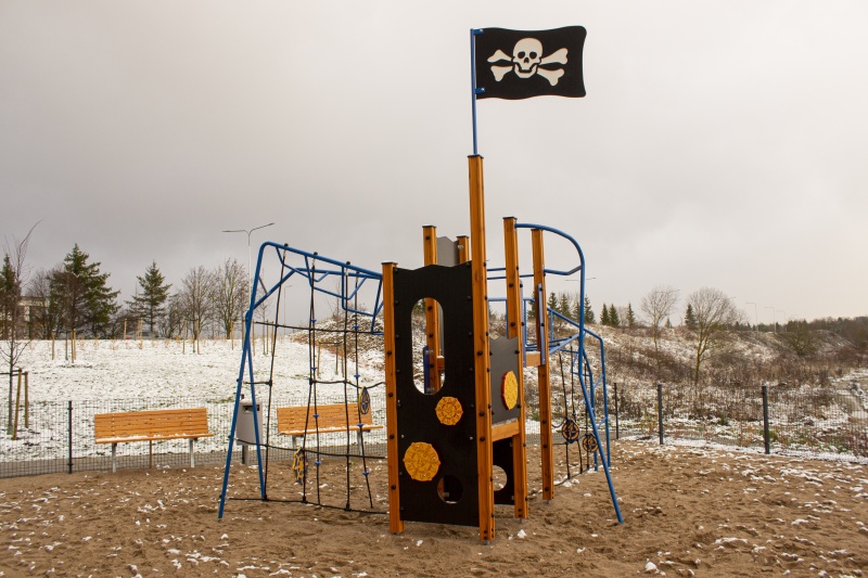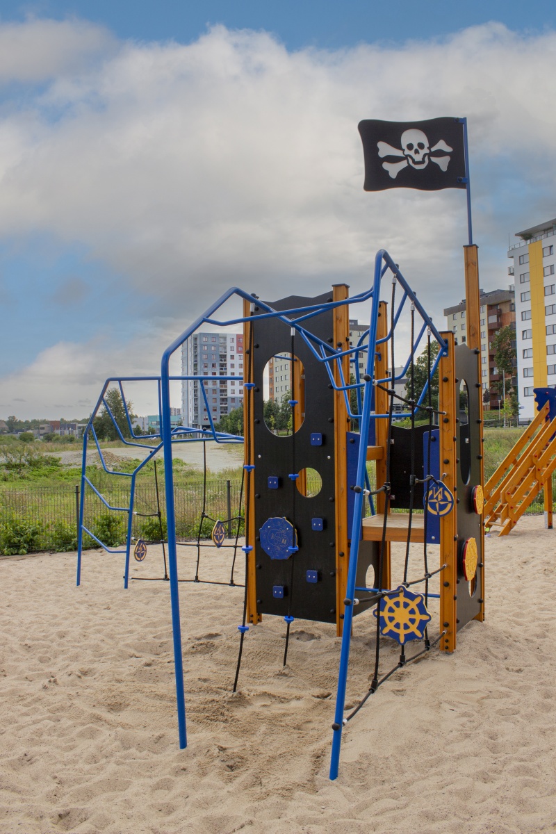 Pirattematiserad lekställning för aktiv lek, samarbete och fantasifulla äventyr på lekplatsen.