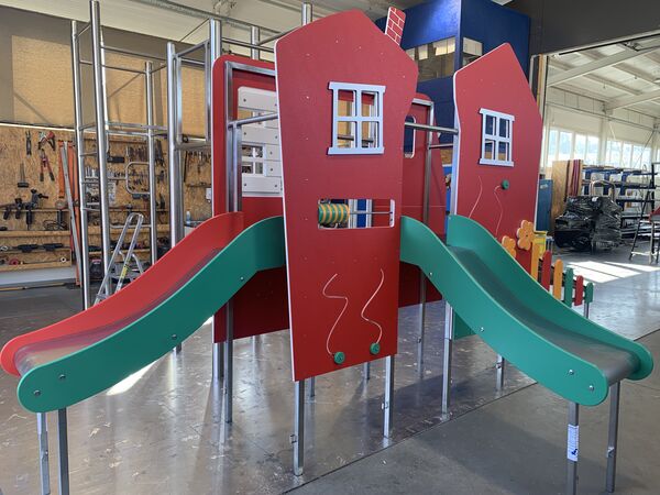 Barnhuset 12068 är särskilt utformat för små barn och erbjuder varierad lek genom två rutschkanor, skjutbräda, glidande hjul för matematikträning samt en liten labyrint för finmotorisk utveckling.