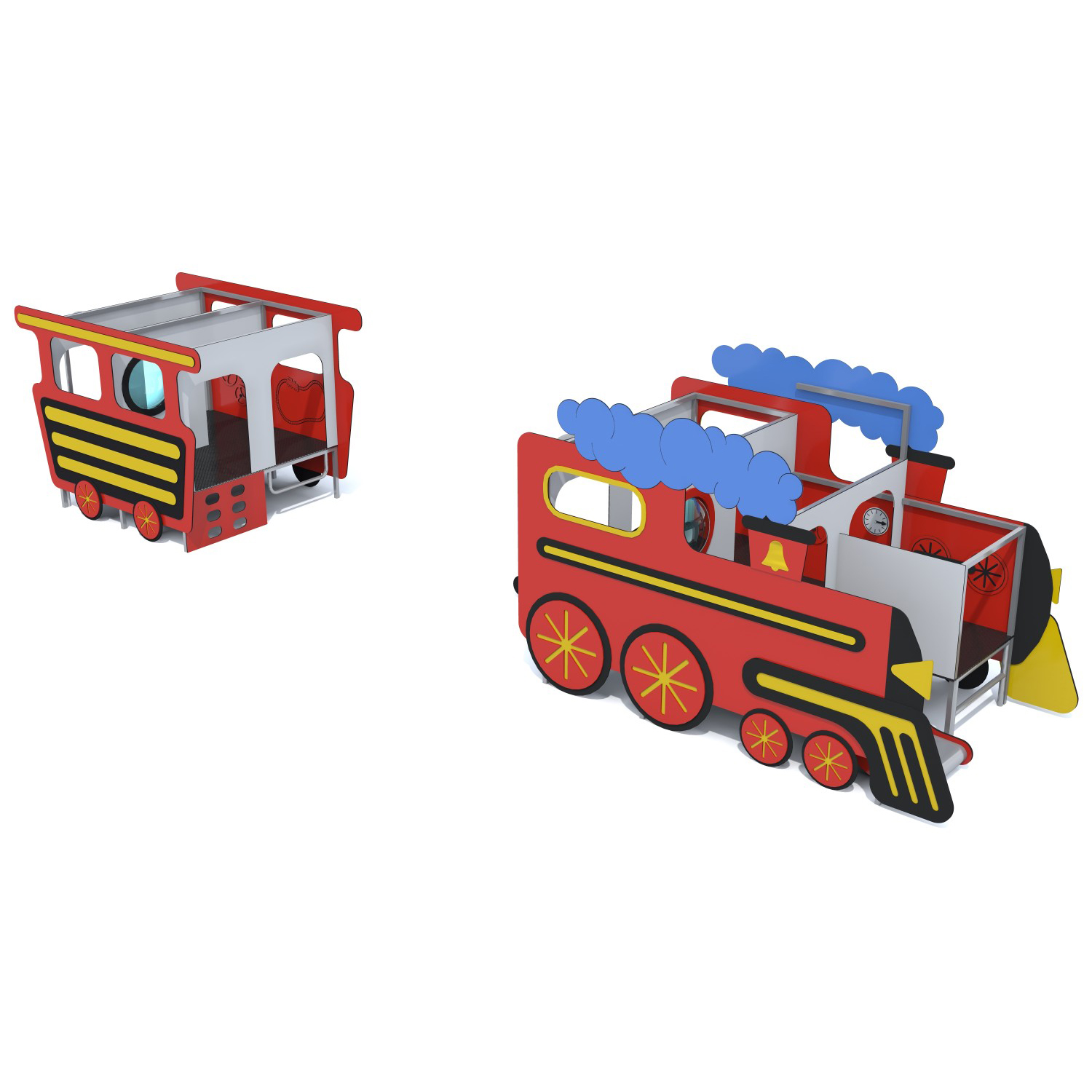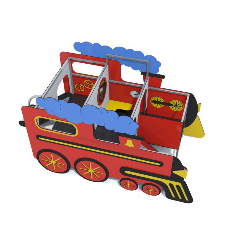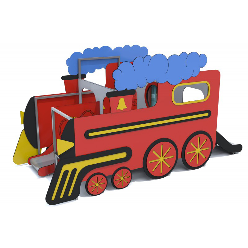 Lekställning med två rutschbanor formgiven som ett stort lok. Stommen är av galvaniserat och pulverlackerat stål. De strukturella väggarna är tillverkade av HPL-skiva och dekorativa delar av HDPE. Golvet består av halksäker HPL-plåt.