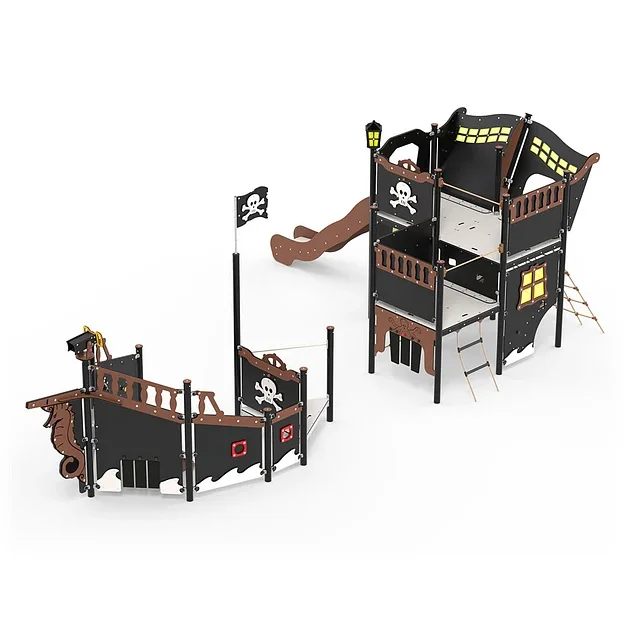 Avancerad piratsektion med styrhytt och flera däcknivåer som skapar rika möjligheter till fantasifull rollekslek. Utformad för att engagera många barn samtidigt.