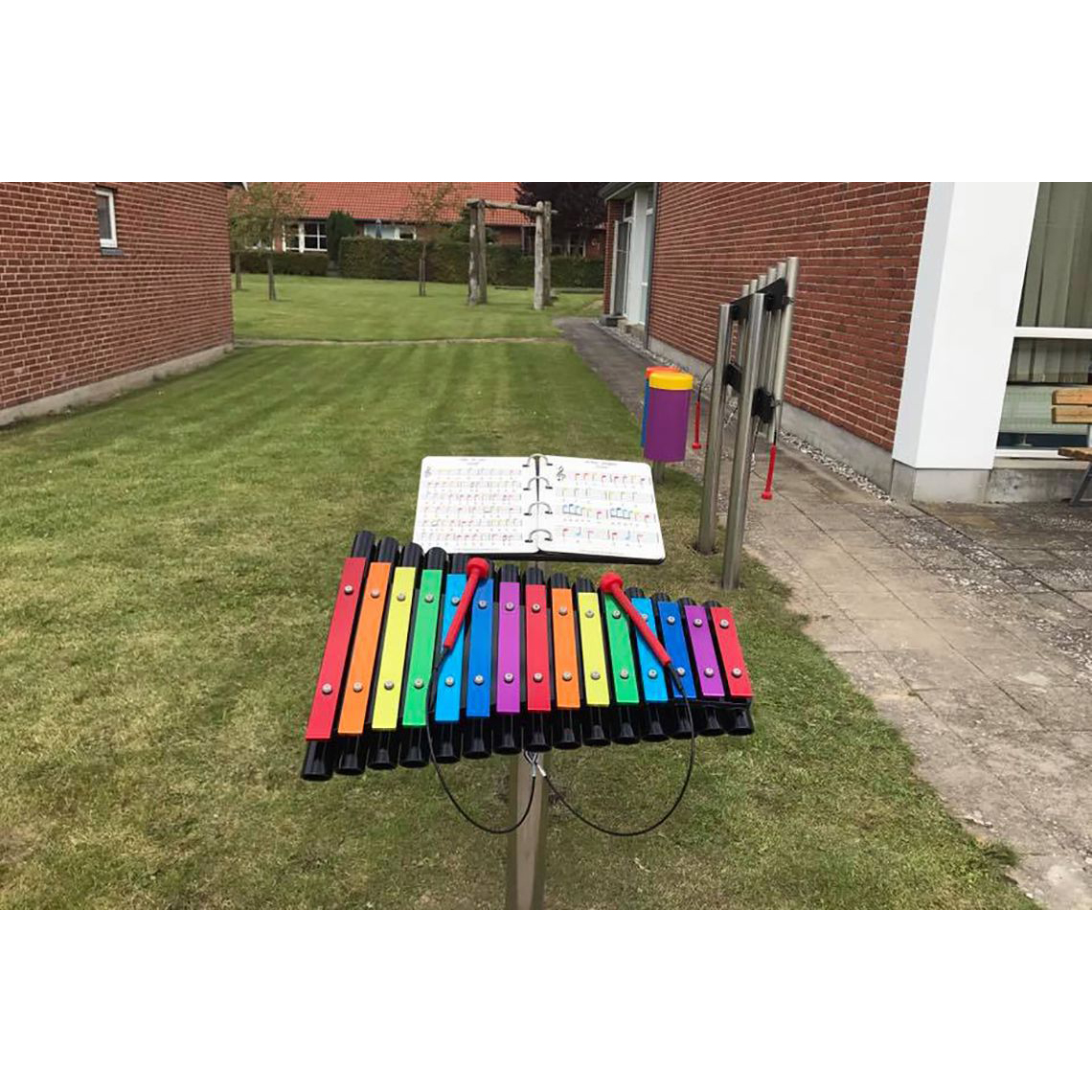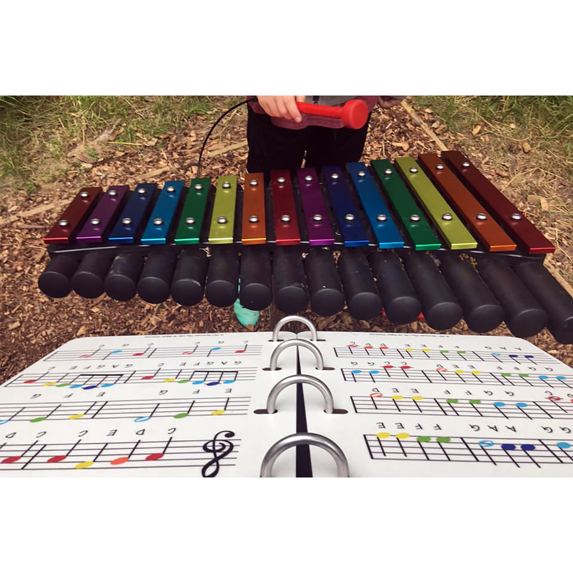 Genom att välja två dubbelsidiga notblad kan användaren lära sig att spela fyra välkända låtar. Musikboken är anpassad för pedagogiskt bruk och samspel med utomhusinstrument.