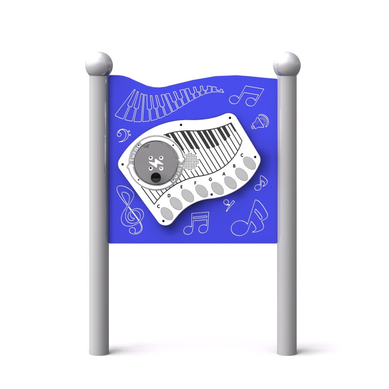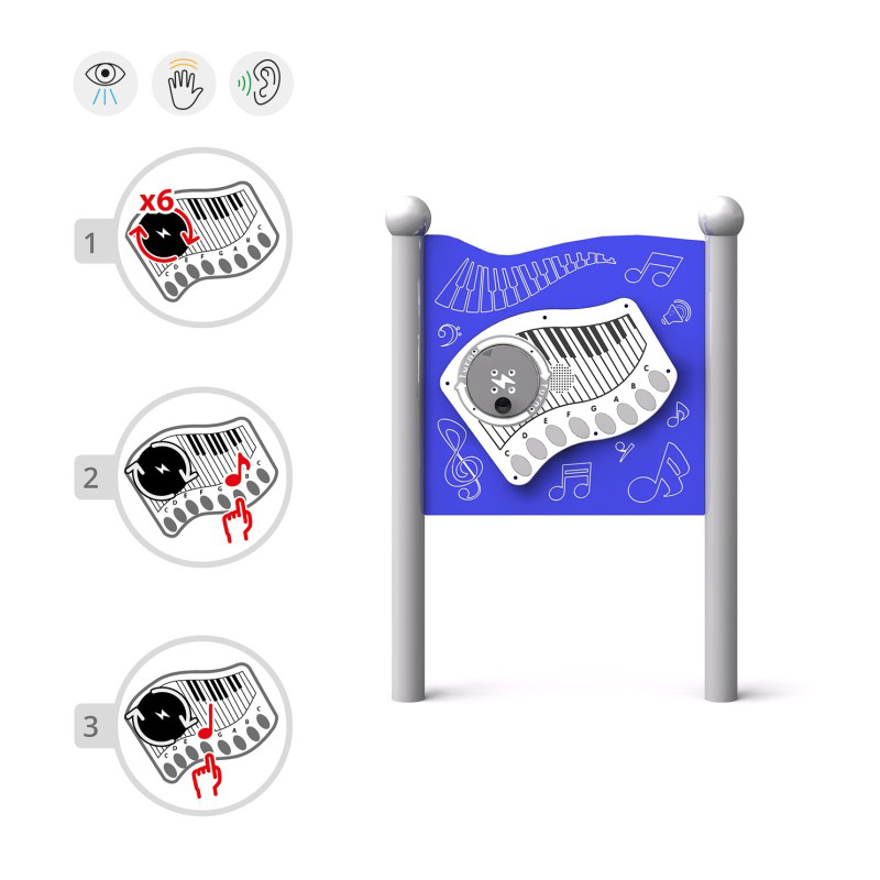 Sensorisk musiktavla som förstärker kreativitet och sinnesupplevelse hos barn, även barn i rullstol. Tavlan är utrustad med ett piano i rostfritt stål med pekknappar som producerar pianotoner i skalan C–C. Tangenterna avger ljud efter att ratten vrids. Konstruktionen är tillverkad av pulverlackerat svart stål, anpassad för intensiv utomhusanvändning. Panelen är gjord av HDPE-plast och stolparna avslutas med sfäriska dekorativa element. Tavlan utvecklar finmotorik, hand-öga-koordination och fantasi. Kan även monteras direkt på vägg med särskilda fästelement. Finns i panelkulörerna grön, gul, röd och blå.