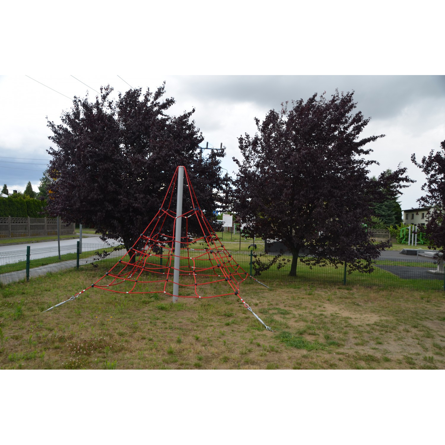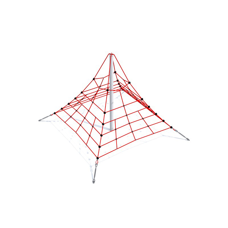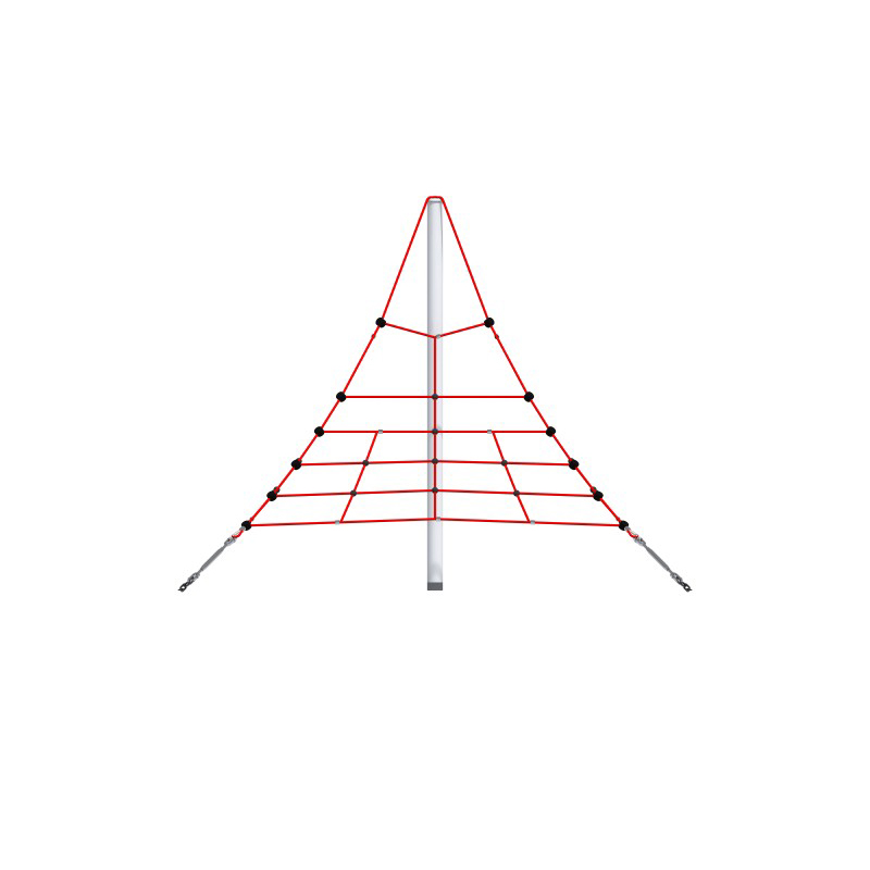 Nätstruktur bestående av fyra klätterväggar, en central stolpe, plastkopplingar och fyra ankare som ger barn möjlighet till varierad klättring från flera håll.