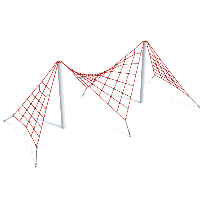 Nätstruktur bestående av tre klätterväggar, två centrala stolpar, plastkopplingar och sex ankare som ger varierad och utmanande klättring.
