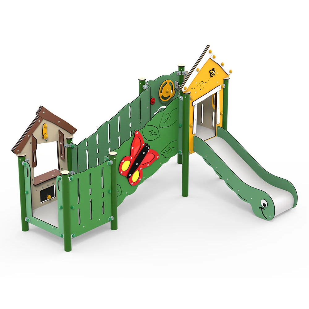 Olivia är en tvåtornslekmiljö i MiniPlay-serien som rymmer upp till 10–12 barn. Den populära butiken med klocka och varuin-lucka stimulerar rollekslek och socialt samspel. Den sluttande bron med fjärilsvingar i färgad polykarbonat utmanar balans och ger visuella upplevelser. Rutschkanan och förarpanelen tränar grov- och finmotorik i trygg skala.