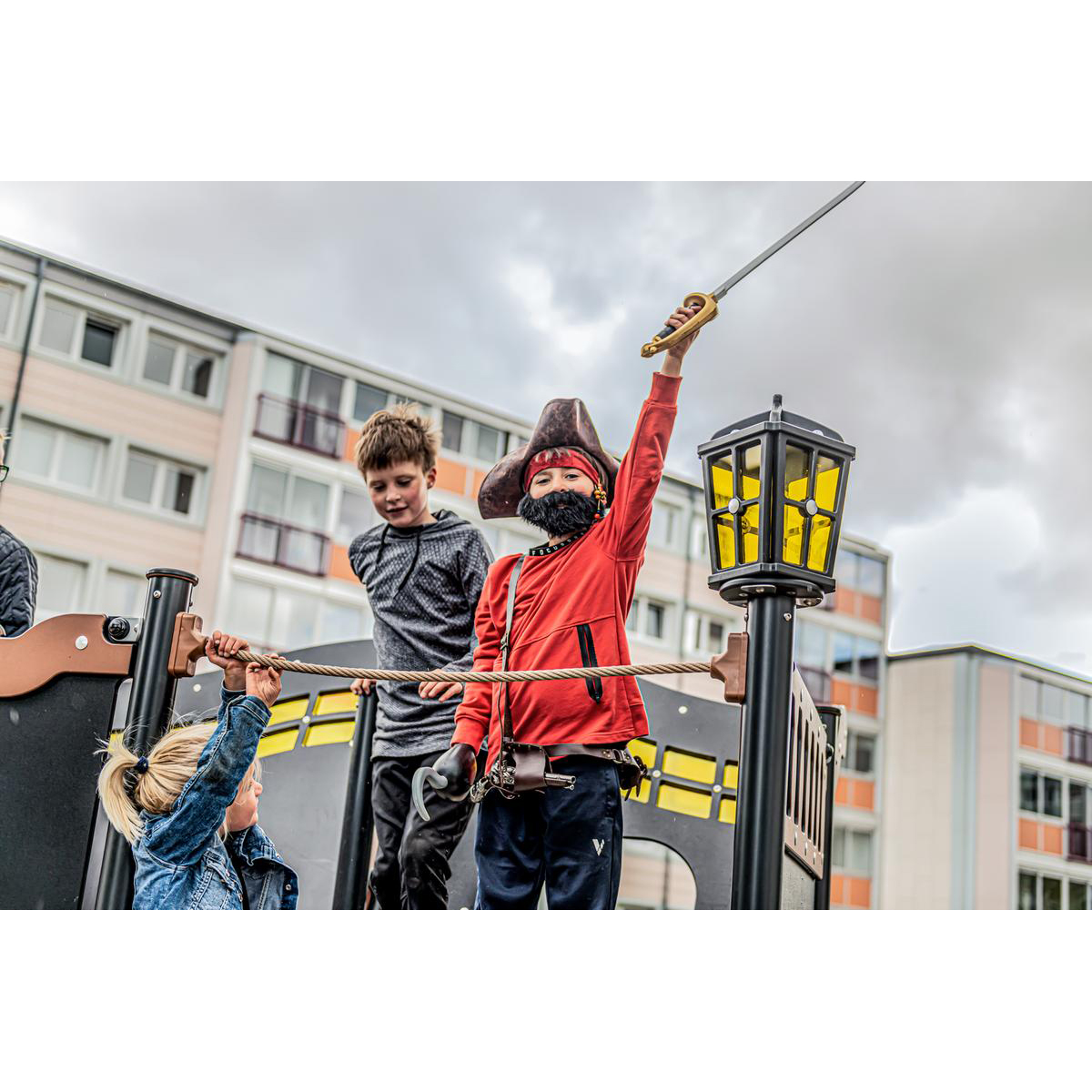 Jättepiratskepp som skapar ett komplett och storskaligt piratuniversum på lekplatsen, anpassat för många barn samtidigt och rik på rollekslek, rörelse och samspel.