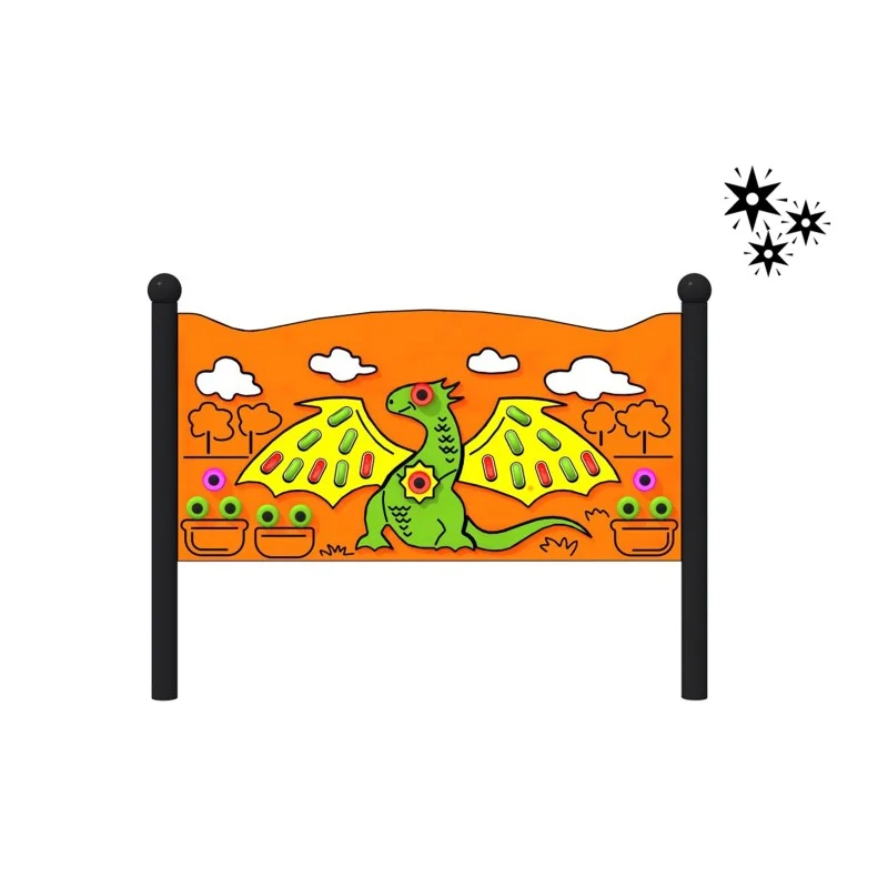 Stor sensorisk tavla designad för kreativ lek, anpassad för användning av barn i rullstol. Huvudtemat har en stor, färgglad drake. Brädan innehåller roterande hjul som avger färgglada ljus när de sätts i rörelse, vilket förbättrar spelupplevelsen. Den har även spår som imiterar träd och moln, vilket skapar en uppslukande miljö. Konstruktionen är gjord av svart, galvaniserat och pulverlackerat stål, vilket garanterar hållbarhet och säkerhet. Skivan är gjord av HDPE-material och rören är färdiga med dekorativa sfäriska element. * Tillgängliga stolpar färger [RAL]: 7016; 9006.