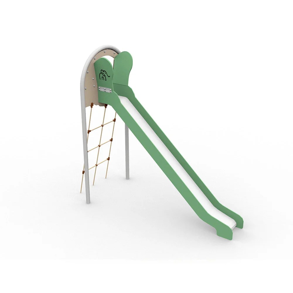 Öppen rutschkana med repstege som kombinerar klättring och glid. Utmanar barnens styrka och koordination.