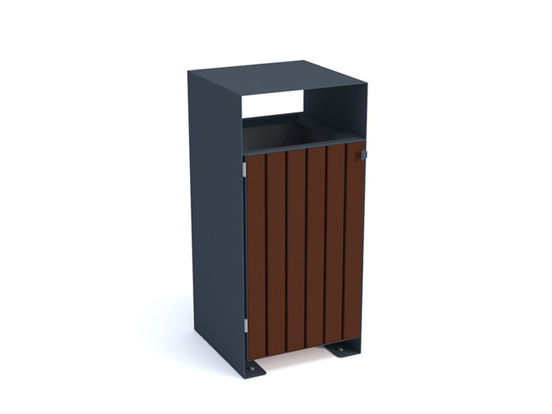 Papperskorg i plåt med träribbor på framsidan. Galvaniserad och målad. Finns även i rostfritt stål. Trä i ljust eller mörkt utförande.