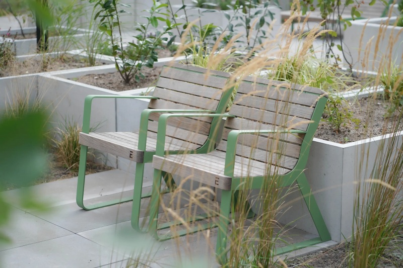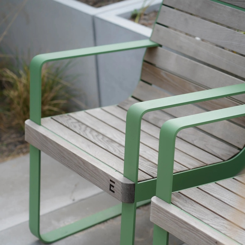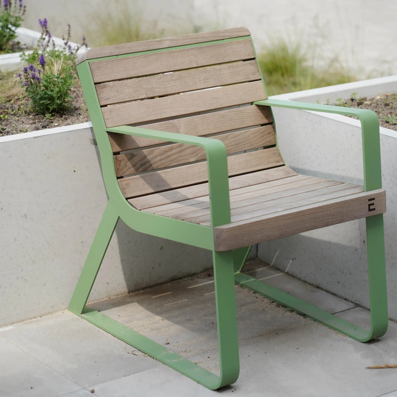 Parkbänk PIRITA med armstöd (0,67 m) är avsedd som en sittplats för en person, för platser där individuella utrymmen efterfrågas. Sitsen består av massivträribbor och bärs av svetsade stålband. Materialkombinationen stål, betong och trä ger en stabil uppbyggnad. Ståldelarna är zinkbelagda och pulverlackerade för korrosionsskydd, vilket kan bidra till lång livslängd och mindre behov av underhåll över tid. Bänken har finish i termoaska och anges ha maximal lastkapacitet 150 kg. PIRITA förankras i betongbas med gängstänger och kan placeras fristående. För projektanpassning kan den fås i olika färg- och materialkombinationer.