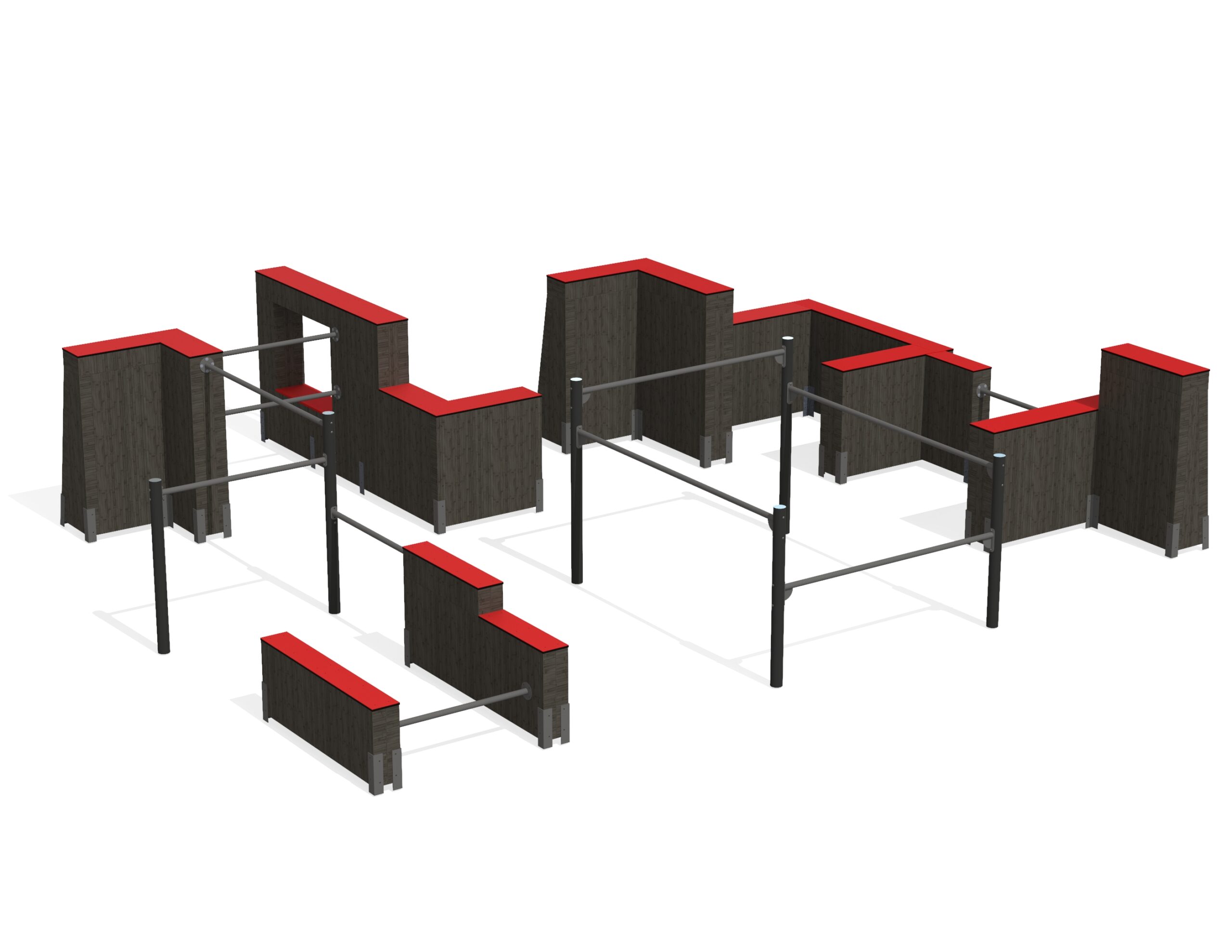 The top edges of wall elements are covered with rubber coated anti-slip plastic which comes in two colour options: grey or red. Horizontal pipes are made of stainless steel and the vertical posts of hot-dip galvanized and powder coated steel. The structure is meant to be fixed on surface (e.g. 150mm reinforced concrete slab foundation). Ground fixings are made of hot-dip galvanized metal.