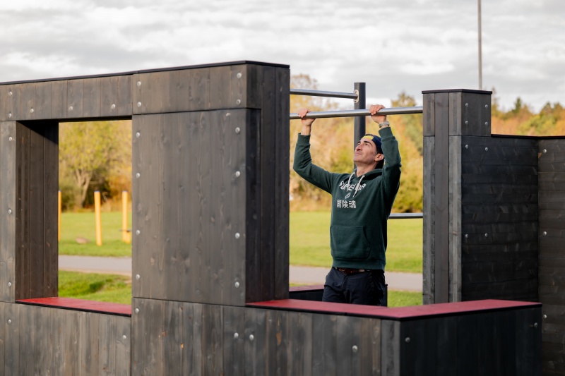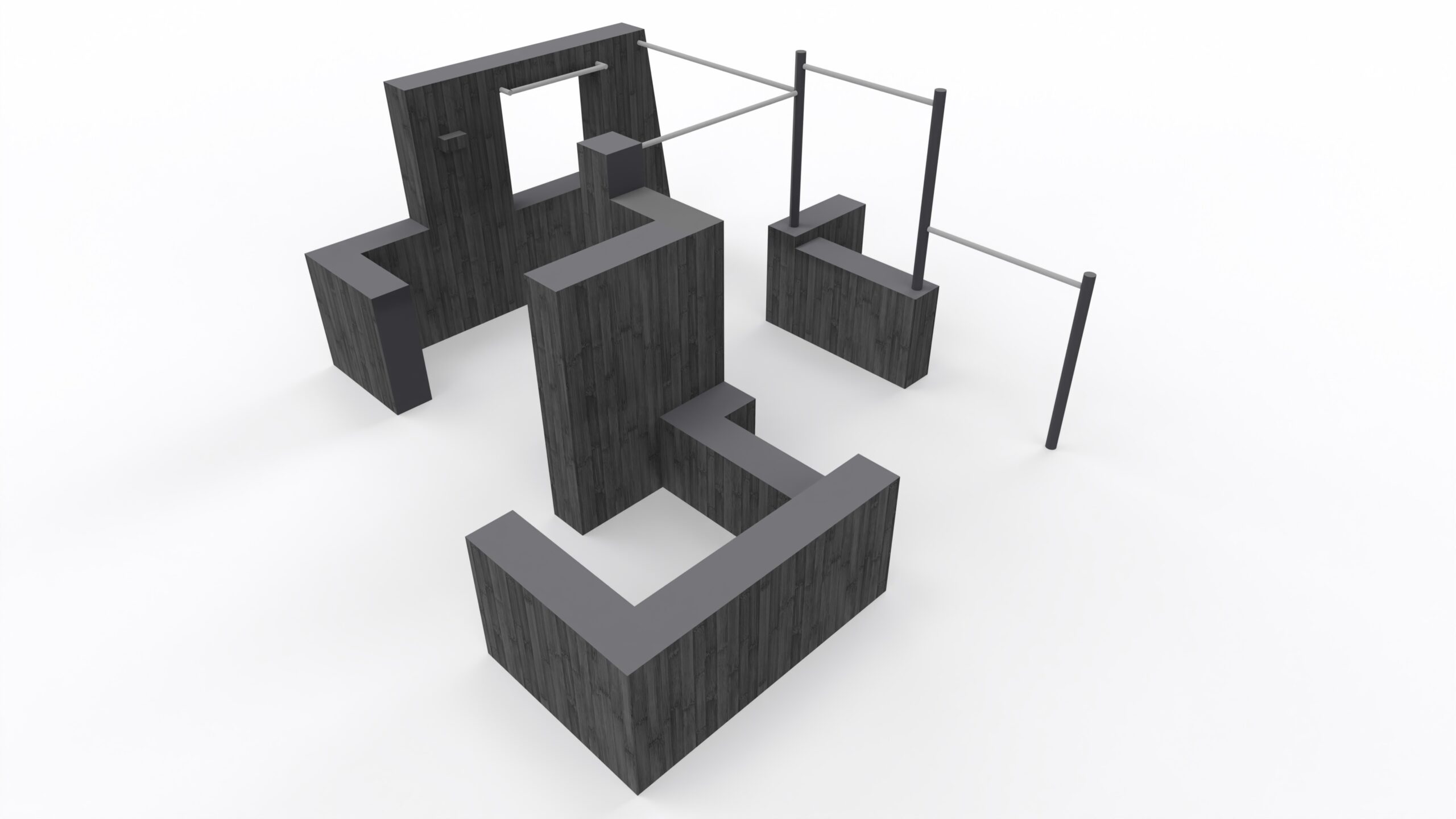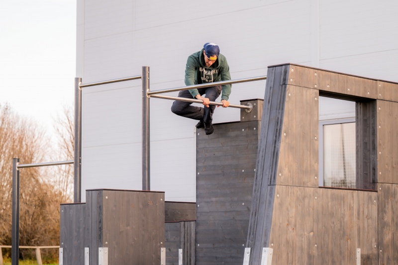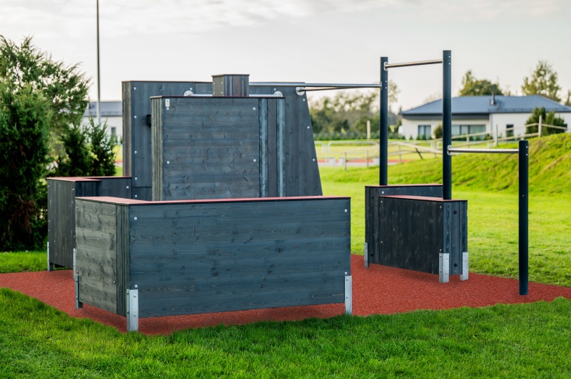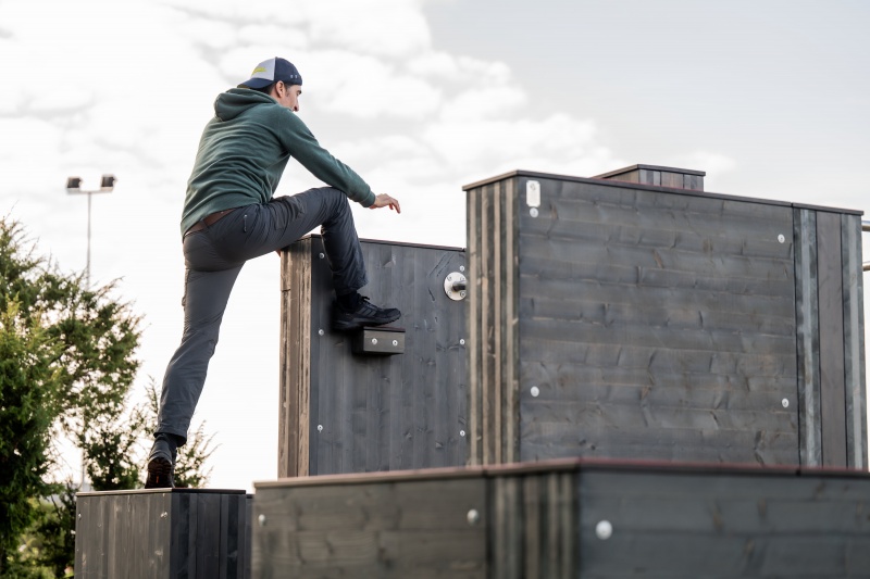 Parkourstruktur där väggelementen är tillverkade av hållbart korslaminerat trä (CLT) för stabilitet och hållbarhet. Träet är behandlat i en fyrastegsprocess för väderbeständighet. Övre kanter är täckta med plast och halkskydd. Horisontella rör är tillverkade av rostfritt stål. Konstruktionen förankras i marken med varmförzinkade ankare i betong.