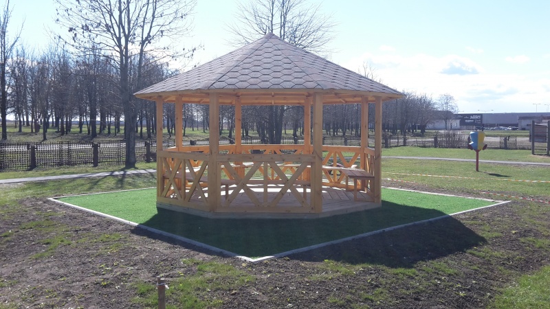 Paviljong Alice 14 m2 Målad är en stor paviljong i naturligt torkad gran eller furu, färdigbehandlad med tonad träskyddsbets. Den diagonala diametern är cirka 4,2 m med bänkar och sidlängden 1,6 m, vilket ger en generös yta för sociala aktiviteter och längre vistelser utomhus. Den målade ytbehandlingen skyddar träkonstruktionen och gör modellen mer motståndskraftig mot väderpåverkan över tid. Nyanser kan väljas för att harmoniera med omgivningens färgsättning. Alice är ett lämpligt val för parker, gårdar och offentliga miljöer där både skala, hållbarhet och visuellt uttryck är viktiga. Produkten är utvecklad för regelbunden användning i offentlig utemiljö och ger stabil funktion över tid.