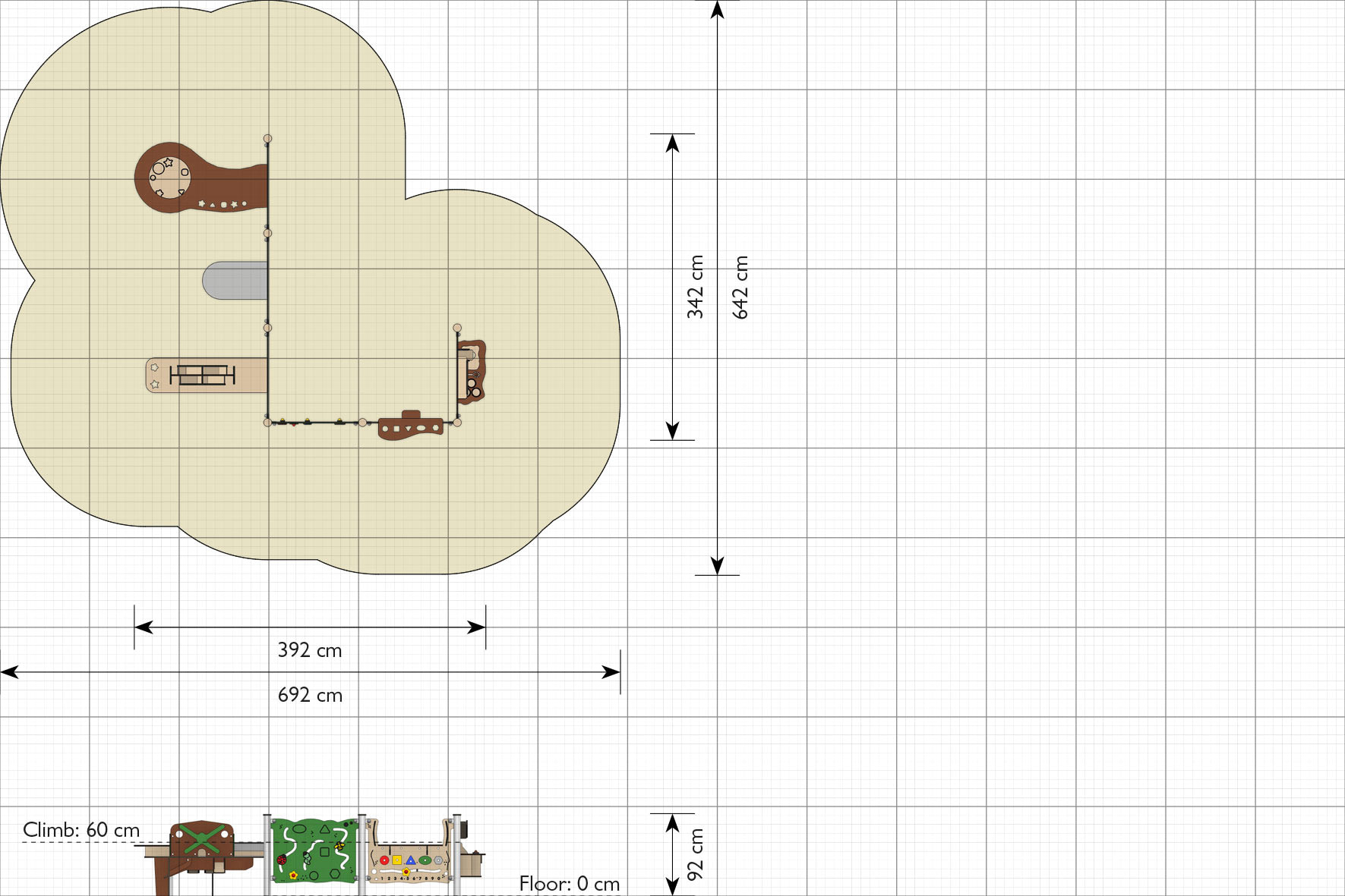 Aktivitetspanel som skapar tydliga lekytor och stimulerar fantasi, roll lek och socialt samspel. Passar särskilt bra i sandlådor och som rumsavdelare på lekplatsen.