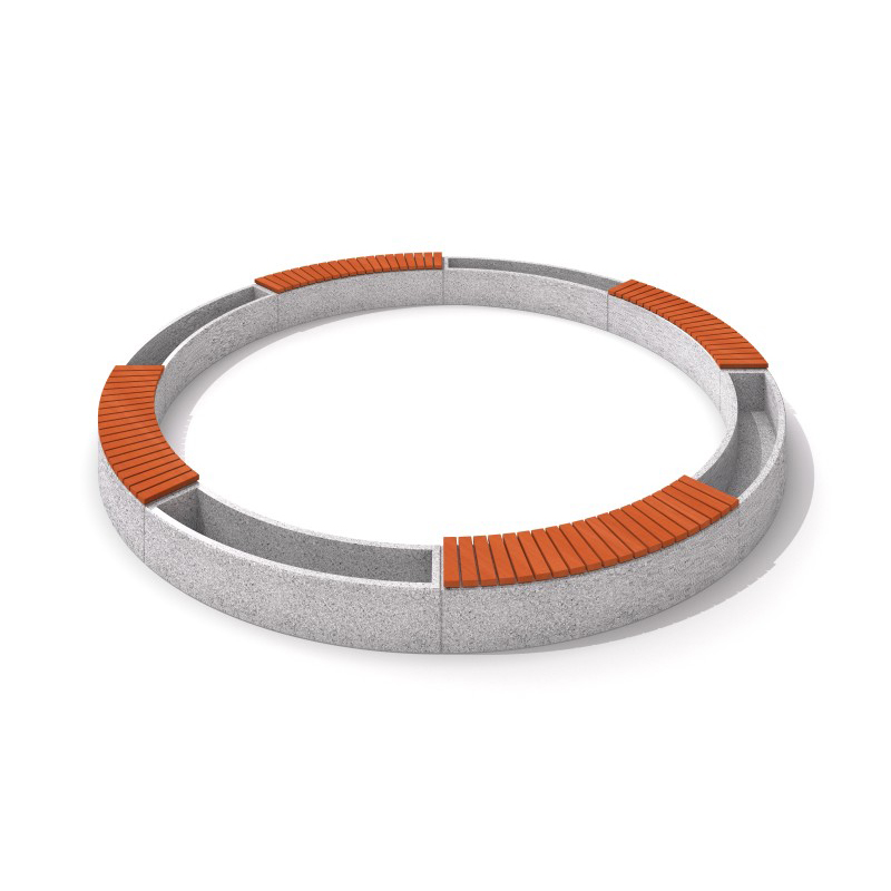 4 arched planters KT-0 5-CR-0 02 Gjord av concrete reinforced med stål och 4 benches KT-0 1-CR-0 04 on a plancircle (ca. 6 m.Diameter). Seatthe bench Gjord av trä.