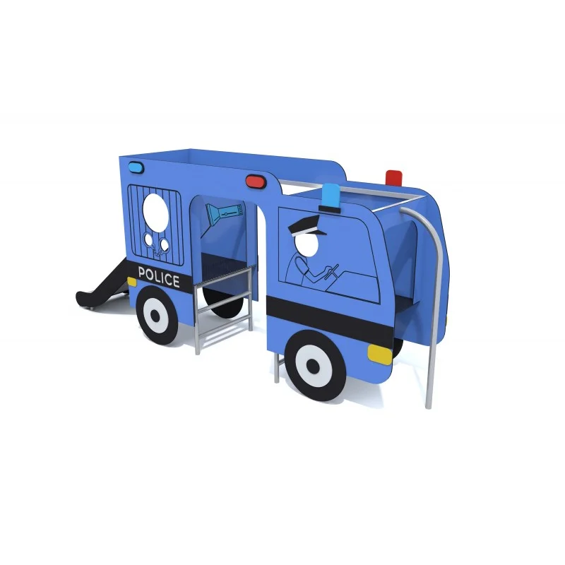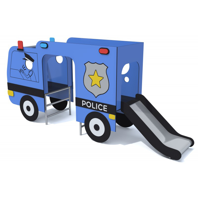 Lekplats med rutschkana som föreställer en polisbil. Konstruktionen är tillverkad av stål och utformad för krävande utomhusmiljöer. Väggarna består av HPL-skiva och dekorativa detaljer i HDPE. Golvet är av halksäker HPL-plåt.