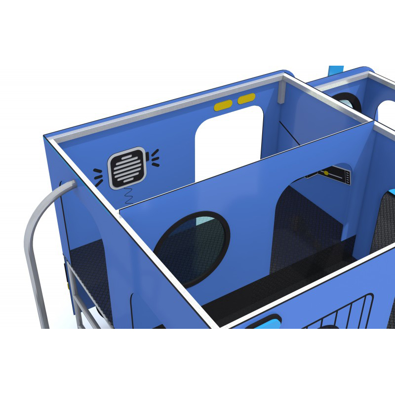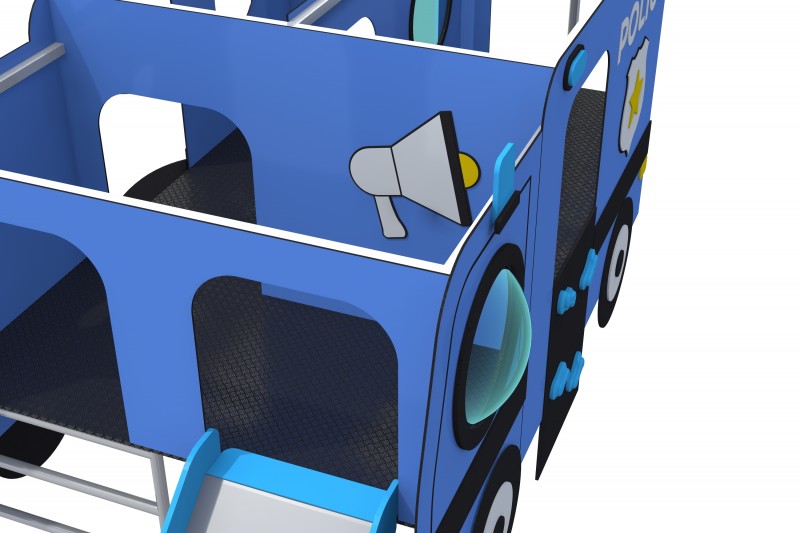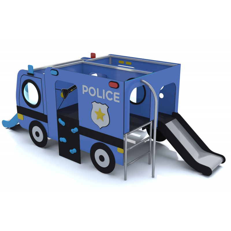 Lekplats med rutschbanor som ser ut som en polisbil. Stommen är av stål och motståndskraftig mot väder och slitage. Väggarna är tillverkade av HPL-skiva och kompletterade med HDPE-detaljer. Golvet är gjort av halksäker HPL-plåt.