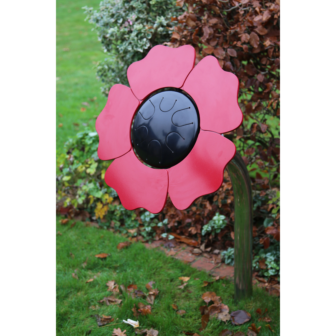 Med sina vallmoröda kronblad och centrala svarta trumma blir detta instrument ett tydligt blickfång. Det erbjuder både musikalisk kvalitet och estetiskt värde i parker, lekplatser och sensoriska miljöer.