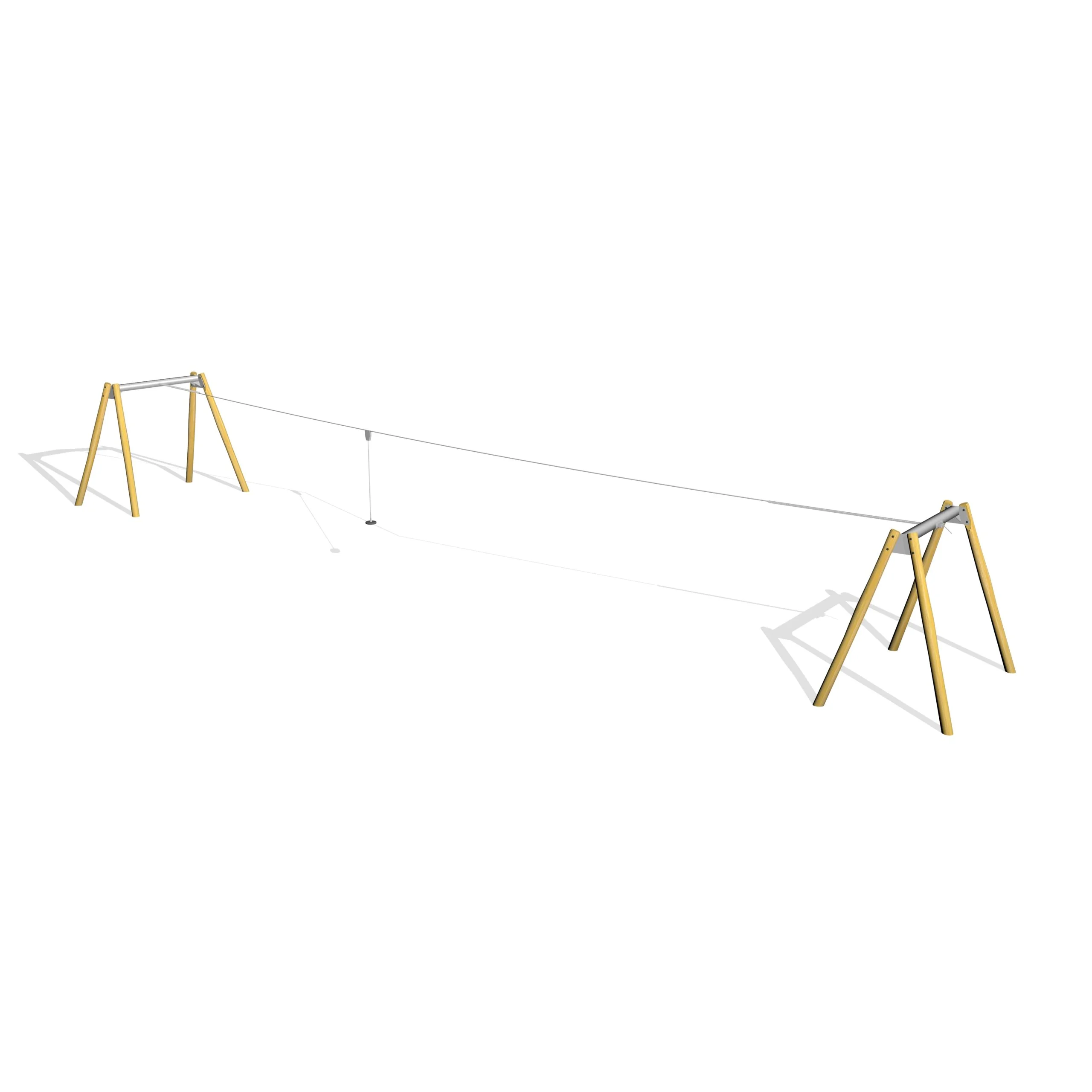 Linbana med stativ av robiniastolpar och stålbalk, anpassad för 20 meters åklängd. Linbanan är utrustad med säkerhetsgodkänt vajersystem och vagn och erbjuder en hållbar och stabil lösning för fartfylld lek.