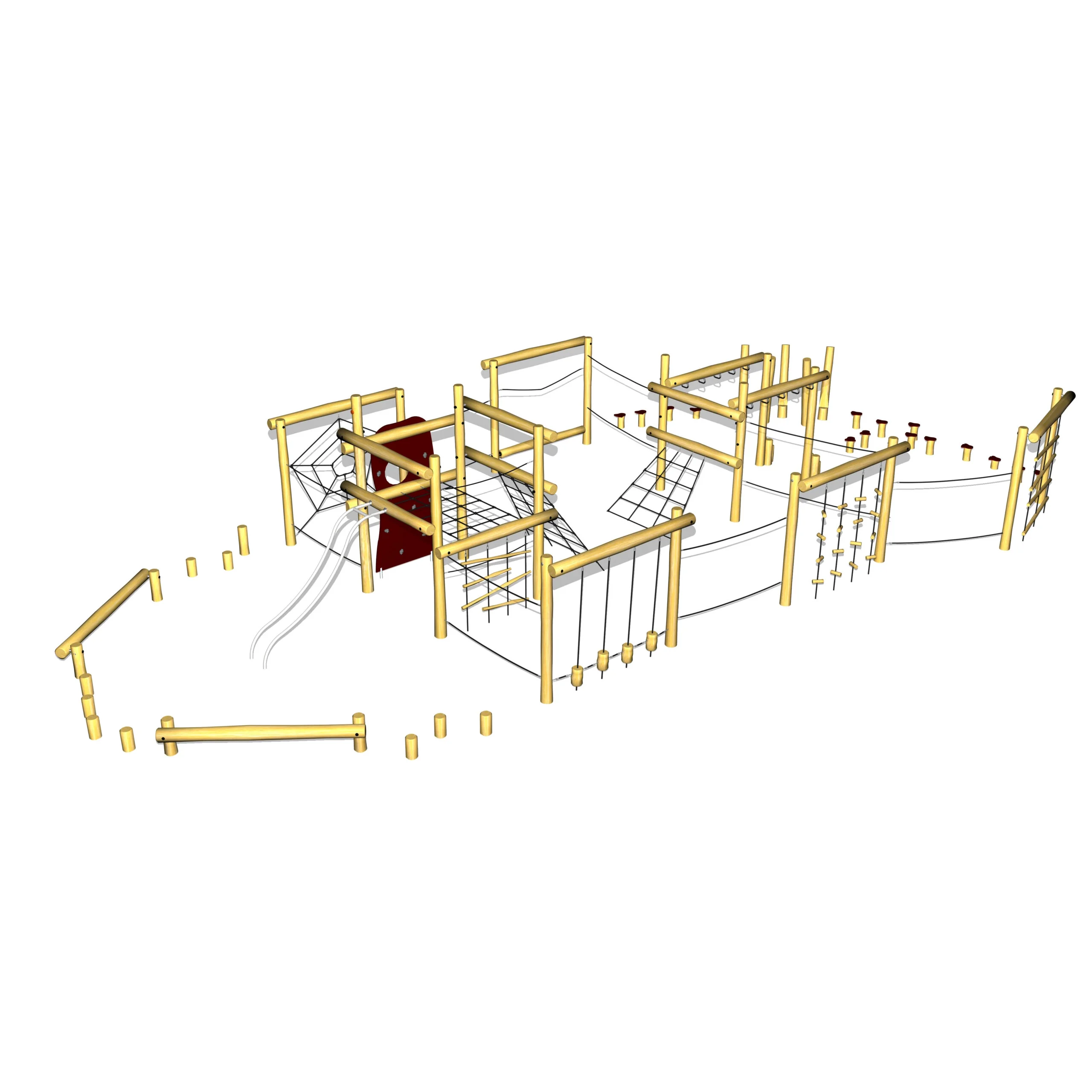 Systemet kombinerar klätterelement med balanseringsspår och skapar en sammanhängande lekmiljö för rörelse och motorisk utveckling.
