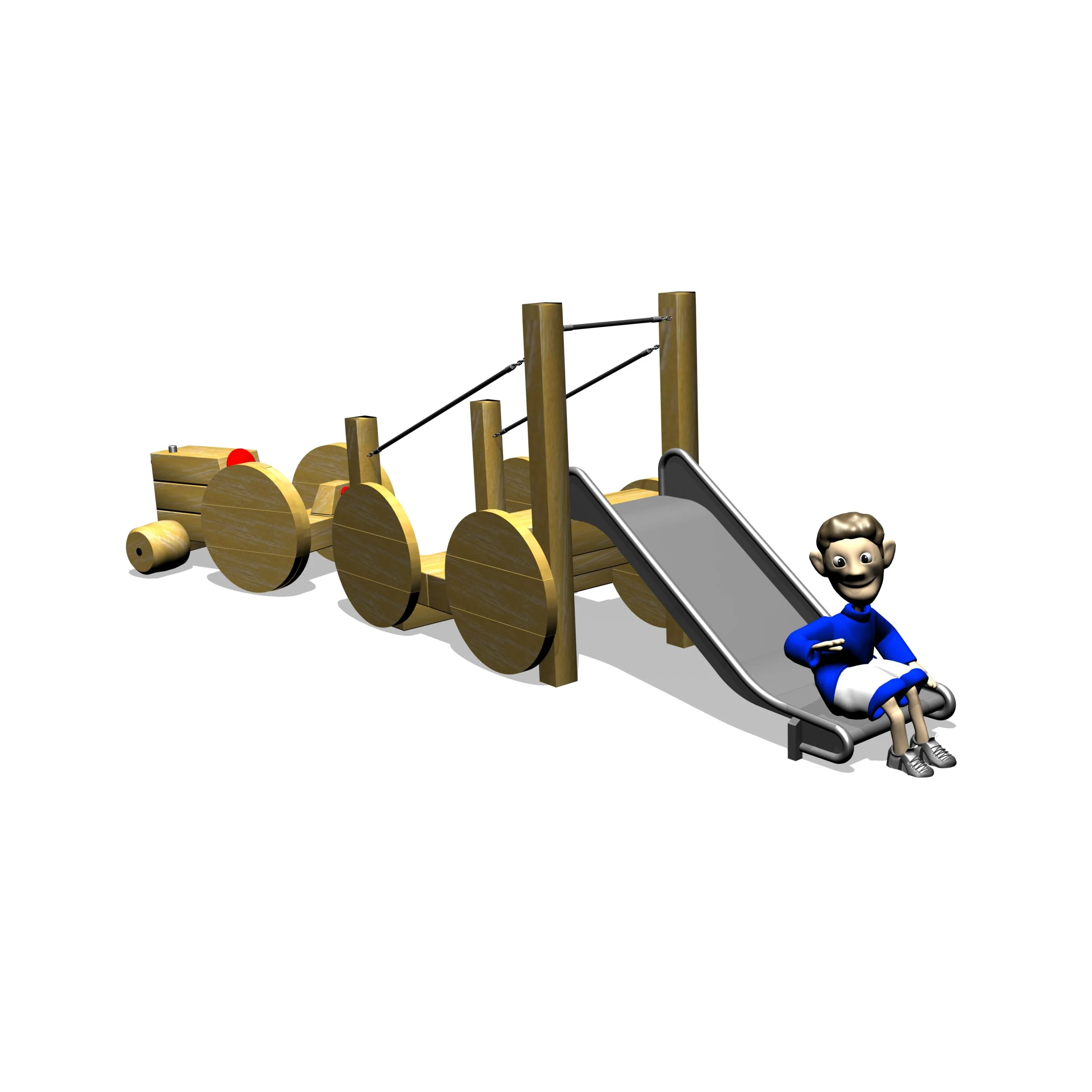 Kombinerad lekstruktur med fordon, klättring och rutschlek. Ett mångsidigt lekelement med högt lekvärde.
