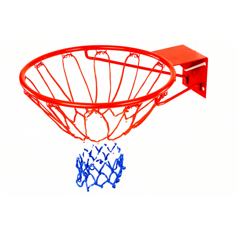 Röd standardbasketkorg med nylonnät för utomhusbruk.