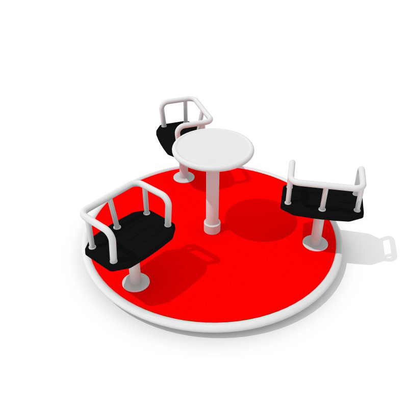 Lekplatsrondell med diameter 1,58 m; tre säten placerade på karusellernas tre armar anslutna till den centrala stolpen med en rund cirkel som flyttar produkten. Golvet är täckt av PE-plåt. Tack vare denna lösning rundan