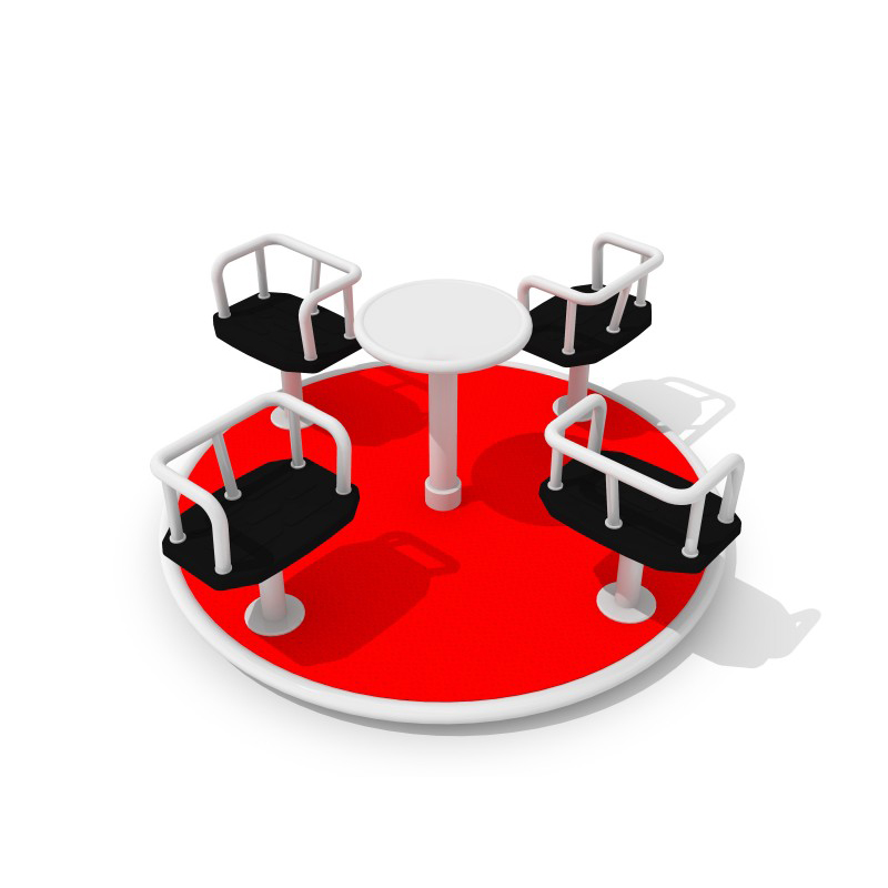 Lekplatsrondell med diameter 1,58 m; fyra säten placerade på karusellernas fyra armar anslutna till den centrala stolpen med en rund cirkel som flyttar produkten. Golvet är täckt av PE-plåt. Tack vare denna lösning rundbanan