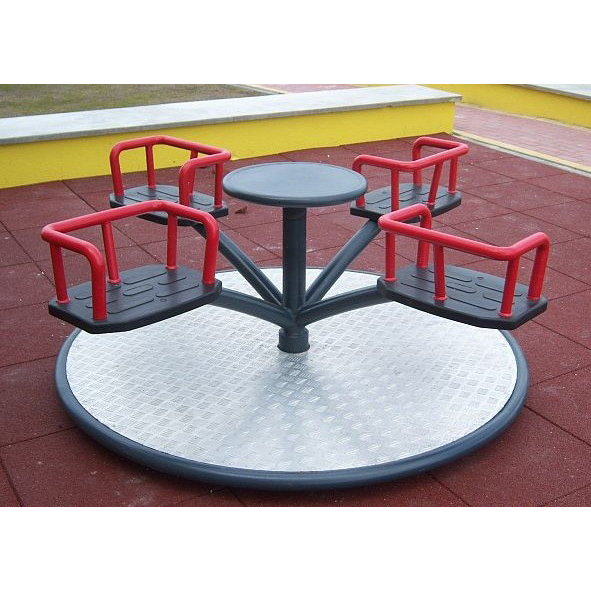 Lekplatsrondell med diameter 1,58 m och fyra platser placerade på karusellernas fyra armar anslutna till den centrala stolpen med en rund cirkel som flyttar produkten. Golvet är täckt av PE-plåt. Tack vare denna lösning omgången