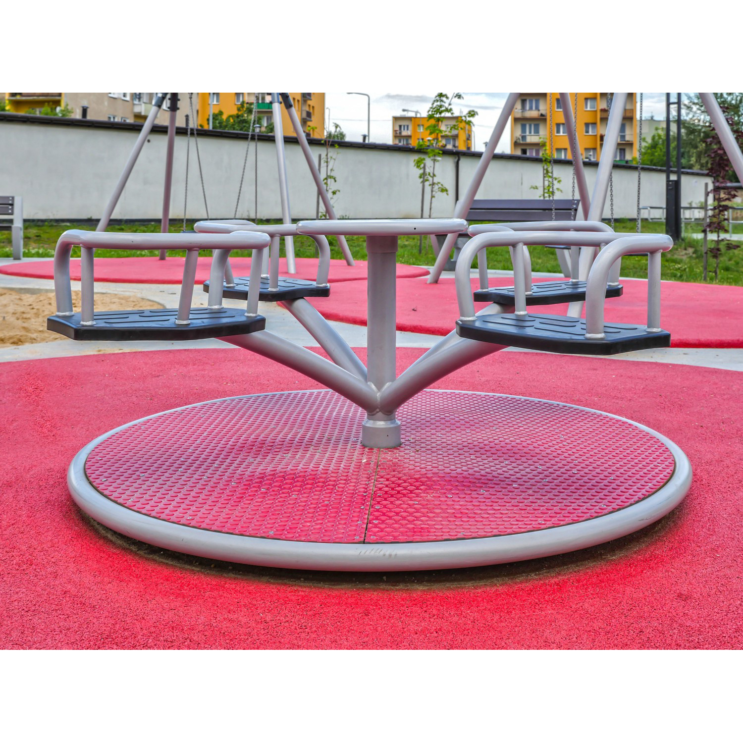 Lekplatsrondell med diameter 1,58 m och fyra platser placerade på karusellernas fyra armar anslutna till den centrala stolpen med en rund cirkel som flyttar produkten. Golvet är täckt av PE-plåt. Tack vare denna lösning är rondellens golv mjukt (mer säkerhet) och halkskydd. Dessutom värmer det inte under soliga dagar och det fryser inte under vintern.