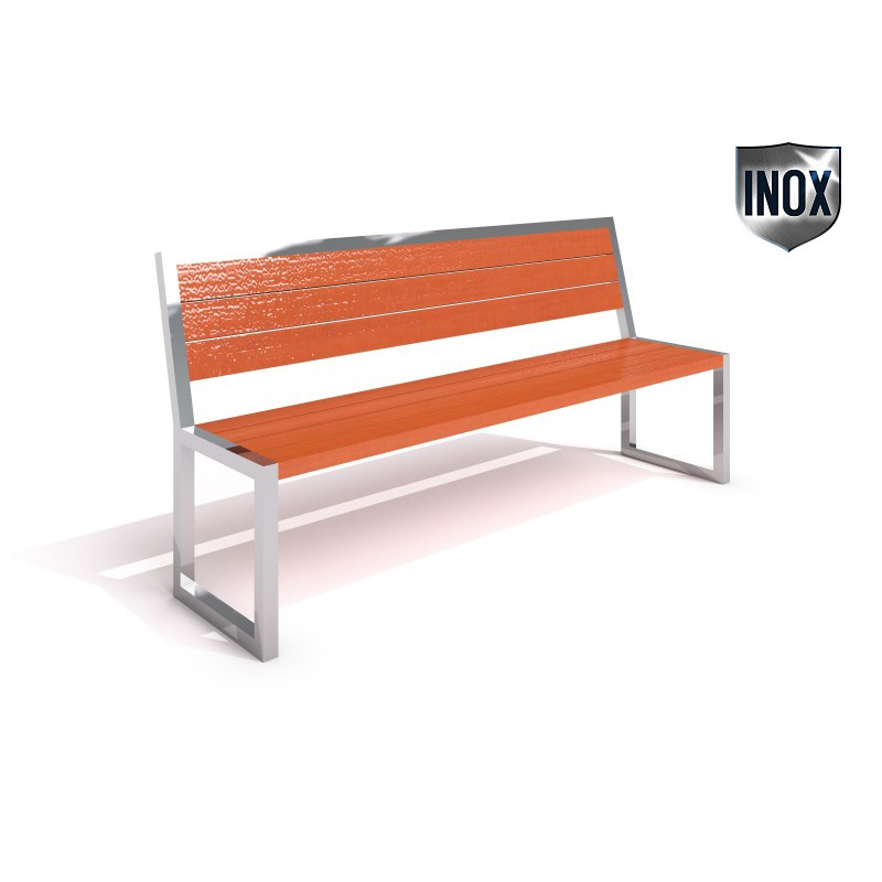 Rostfri bänk med ryggstöd och armstöd. Sits och ryggstöd i granträ, tillgängligt i ek eller palisander. Enkel, stilren urban design.