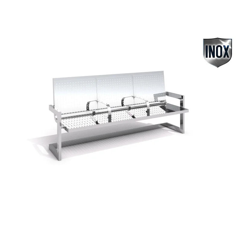 Rostfritt stål bänk med backrest och 4 armrests. Säte och backrest made av rostfritt stål plate (1,5 mm). Den bänk keeps elegant och simple look av urban furniture.