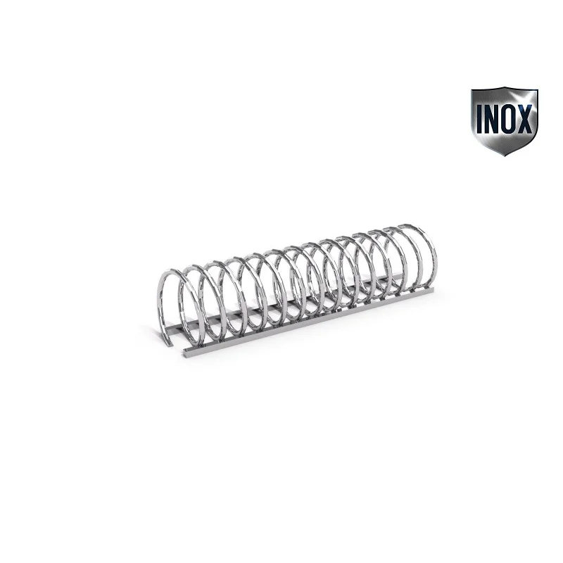 Spiralt cykelställ i rostfritt stål för 4 cyklar.