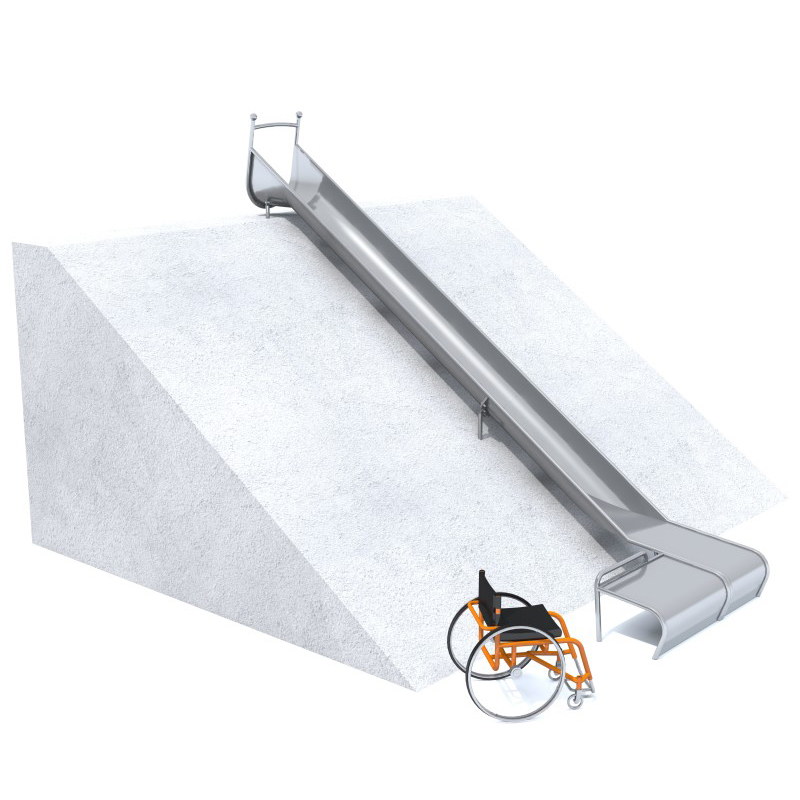 Gliti H2400 är en inkluderande släntrutschkana med rak trågform och avslutande sits som ger säker och kontrollerad förflyttning. Konstruktionen stöds av åtta fundamentben i rostfritt stål för ökad stabilitet. Tillverkad i rostfritt stål AISI 304 (1.4301), plåttjocklek 2 mm och profil 33,7 x 2 mm. Polerad yta som är korrosionsbeständig och lätt att rengöra.