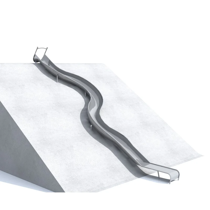 Markrutschkana avsedd för installation på naturliga eller uppbyggda vallar. Spiralformad design med längd 7,68 m och glidbredd 0,5 m. Tillverkad helt i matt rostfritt stål. Avsedd för montering på banvall med höjd 4,0 m.